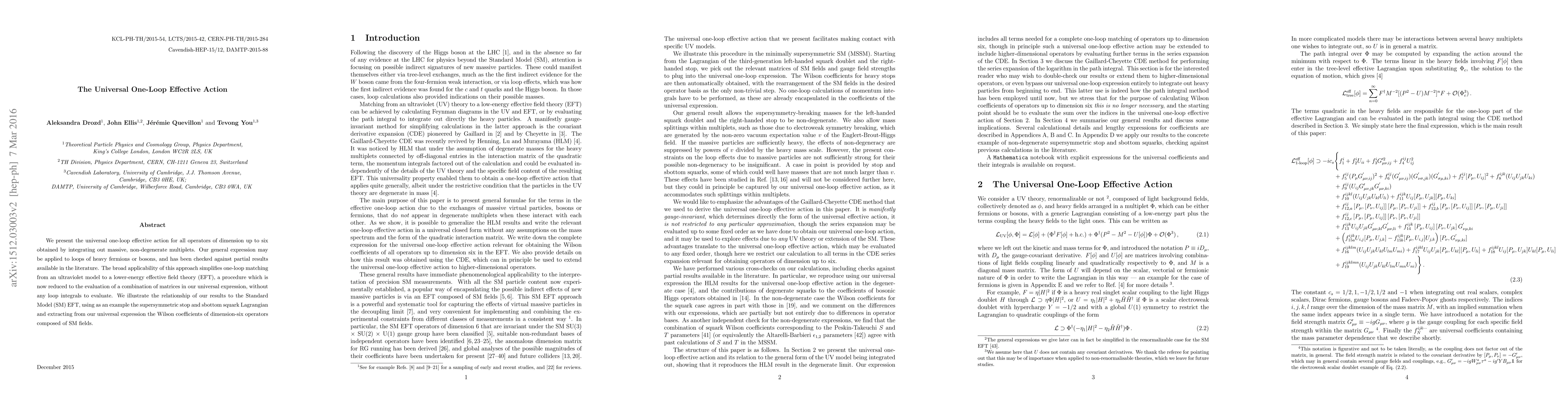 The paper introduces a general, universal expression for the one-loop effective action, simplifying the matching process between UV models and EFTs by reducing complex loop integrals to matrix evaluations.