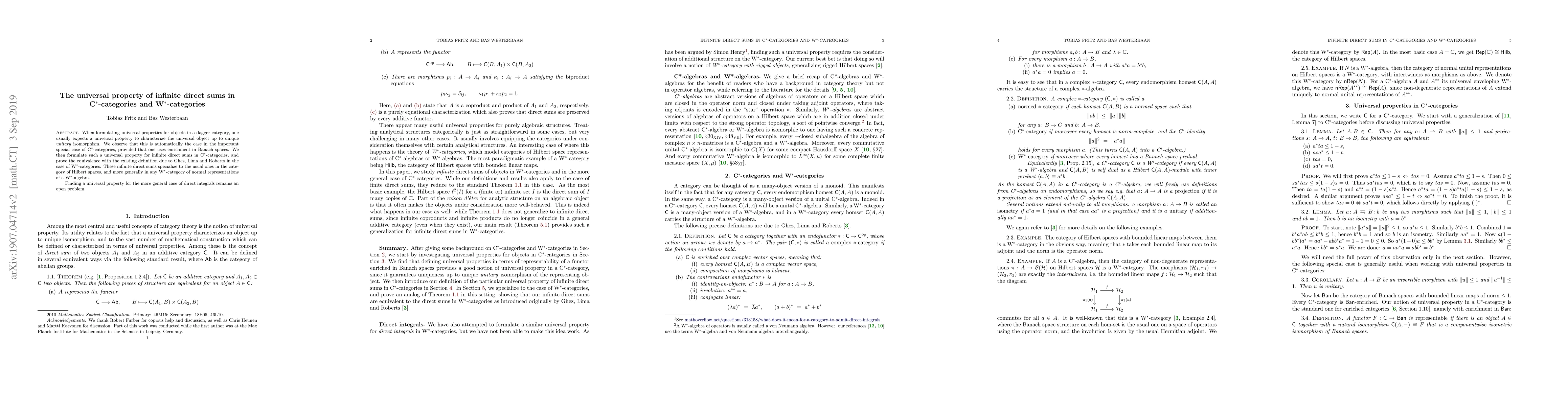 When formulating universal properties for objects in a dagger category, one usually expects a universal property to characterize the universal object up to unique unitary isomorphism. We observe that this is automatically the case in the important special case of C$^*$-categories, provided that one uses enrichment in Banach spaces. We then formulate such a universal property for infinite direct sums in C$^*$-categories, and prove the equivalence with the existing definition due to Ghez, Lima and Roberts in the case of W$^*$-categories. These infinite direct sums specialize to the usual ones in the category of Hilbert spaces, and more generally in any W$^*$-category of normal representations of a W$^*$-algebra. Finding a universal property for the more general case of direct integrals remains an open problem.
