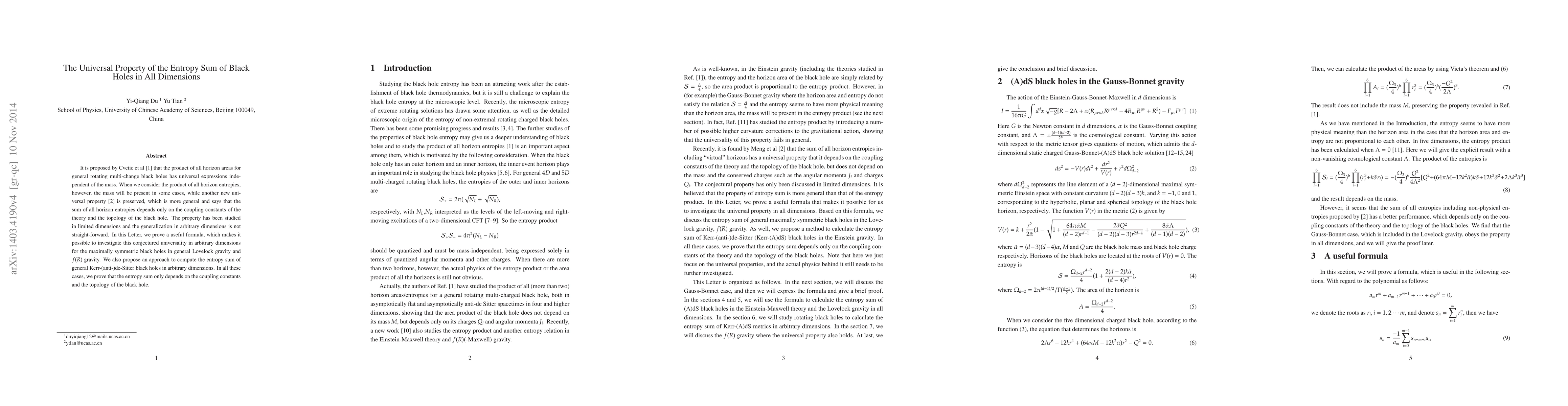 This paper proves a universal property for the sum of entropies of black hole horizons in arbitrary dimensions, showing it depends solely on the coupling constants and topology, not mass. The authors also propose a method to compute the entropy sum for general Kerr-(anti-)de Sitter black holes across dimensions.