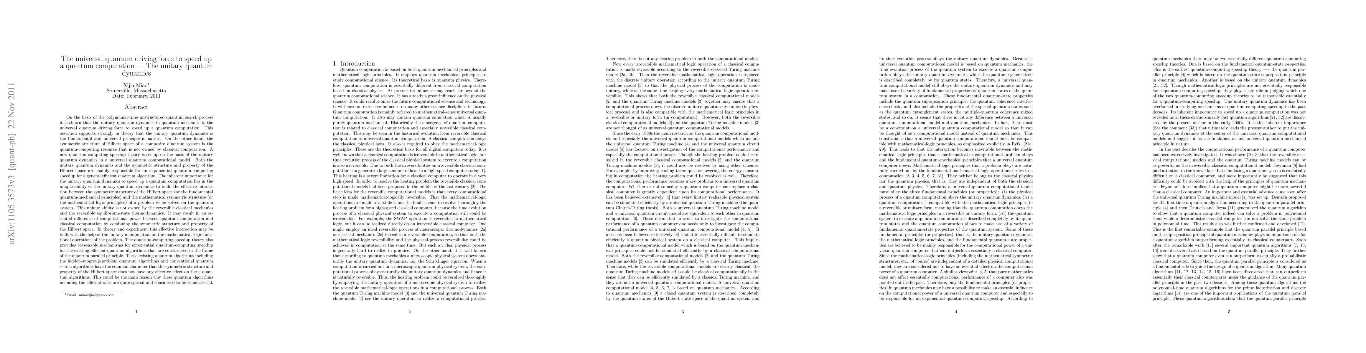It is shown in the paper that the unitary quantum dynamics in quantum mechanics is the universal quantum driving force to speed up a quantum computation. This assertion supports strongly in theory that the unitary quantum dynamics is the fundamental and universal principle in nature. On the other hand, the symmetric structure of Hilbert space of a composite quantum system is the quantum-computing resource that is not owned by classical computation. A new quantum-computing speedup theory is set up on the basis of the unitary quantum dynamics. Both the unitary quantum dynamics and the symmetric structure and property of the Hilbert space of the quantum system are mainly responsible for an exponential quantum-computing speedup for a general efficient quantum algorithm. The inherent importance for the unitary quantum dynamics to speed up a quantum computation lies in the unique ability of the unitary quantum dynamics to build the effective interaction between the symmetric structure of the Hilbert space of the quantum system and the mathematical symmetric structure of a problem to be solved on the quantum system. This unique ability could result in an essential difference of computational power between quantum and classical computations by combining the symmetric structure and property of the Hilbert space. The new quantum-computing speedup theory also provides reasonable mechanisms for exponential quantum-computing speedup for the existing efficient quantum algorithms based on the quantum parallel principle. These existing quantum algorithms including the hidden-subgroup-problem quantum algorithms and conventional quantum search algorithms have the common character that the symmetric structure of the Hilbert space does not have any effective effect on these quantum algorithms. This could be the main reason why these quantum algorithms are quite special and considered to be semiclassical.