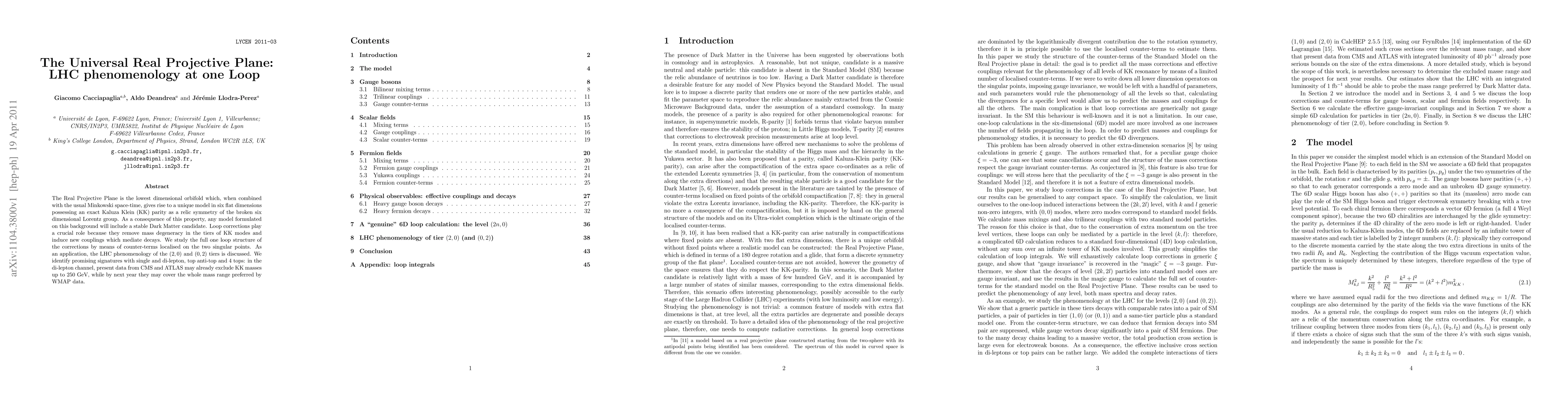 The Real Projective Plane is the lowest dimensional orbifold which, when combined with the usual Minkowski space-time, gives rise to a unique model in six flat dimensions possessing an exact Kaluza Klein (KK) parity as a relic symmetry of the broken six dimensional Lorentz group. As a consequence of this property, any model formulated on this background will include a stable Dark Matter candidate. Loop corrections play a crucial role because they remove mass degeneracy in the tiers of KK modes and induce new couplings which mediate decays. We study the full one loop structure of the corrections by means of counter-terms localised on the two singular points. As an application, the phenomenology of the (2,0) and (0,2) tiers is discussed at the LHC. We identify promising signatures with single and di-lepton, top antitop and 4 tops: in the dilepton channel, present data from CMS and ATLAS may already exclude KK masses up to 250 GeV, while by next year they may cover the whole mass range preferred by WMAP data.
