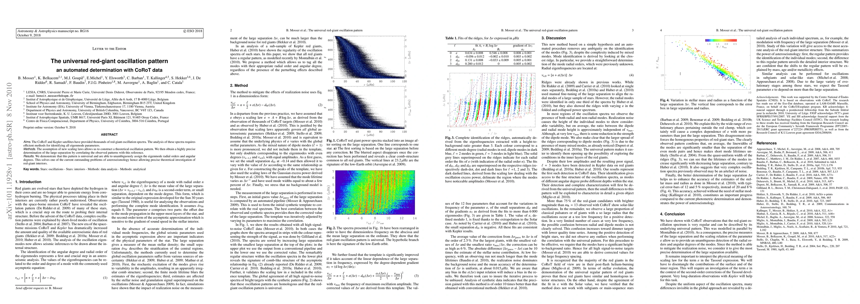 This paper presents an automated method using CoRoT data to determine the universal red-giant oscillation pattern, enabling precise identification of eigenmode parameters and solving a key issue in asteroseismology for detailed red-giant interior studies.