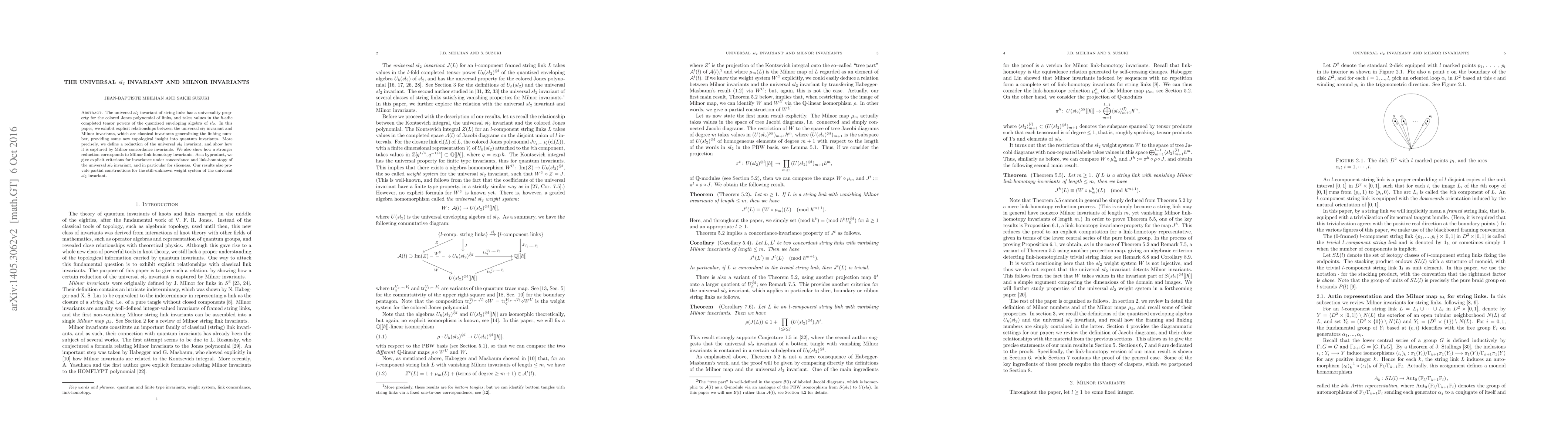 The paper introduces a detailed analysis of the universal sl_2 invariant's behavior concerning Milnor invariants, linking algebraic structures (quantized enveloping algebra) with topological invariants (Milnor invariants).