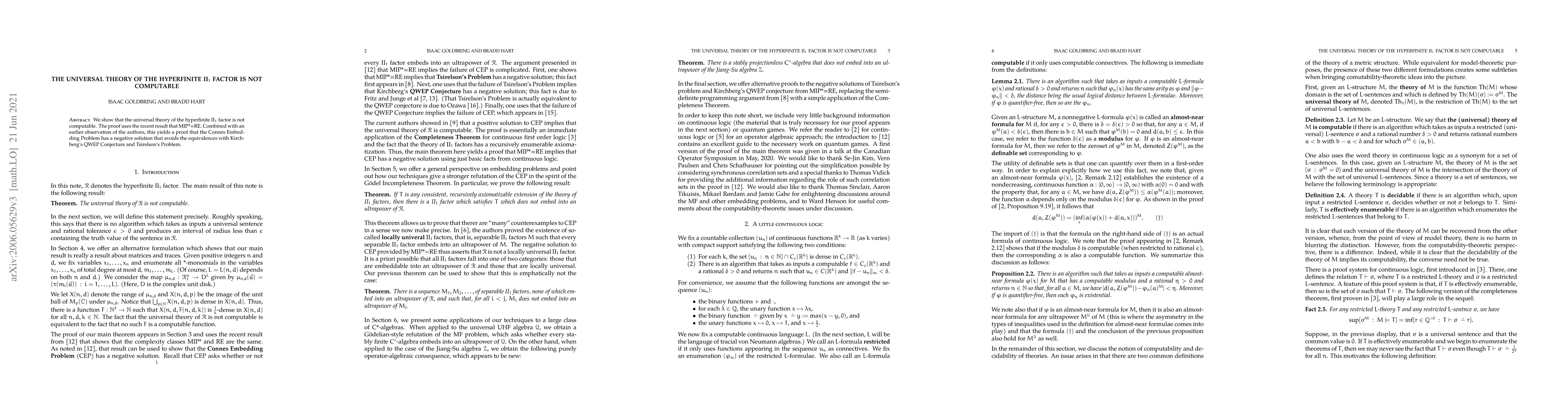 We show that the universal theory of the hyperfinite II$_1$ factor is not computable. The proof uses the recent result that MIP*=RE. Combined with an earlier observation of the authors, this yields a proof that the Connes Embedding Problem has a negative solution that avoids the equivalences with Kirchberg's QWEP Conjecture and Tsirelson's Problem.+