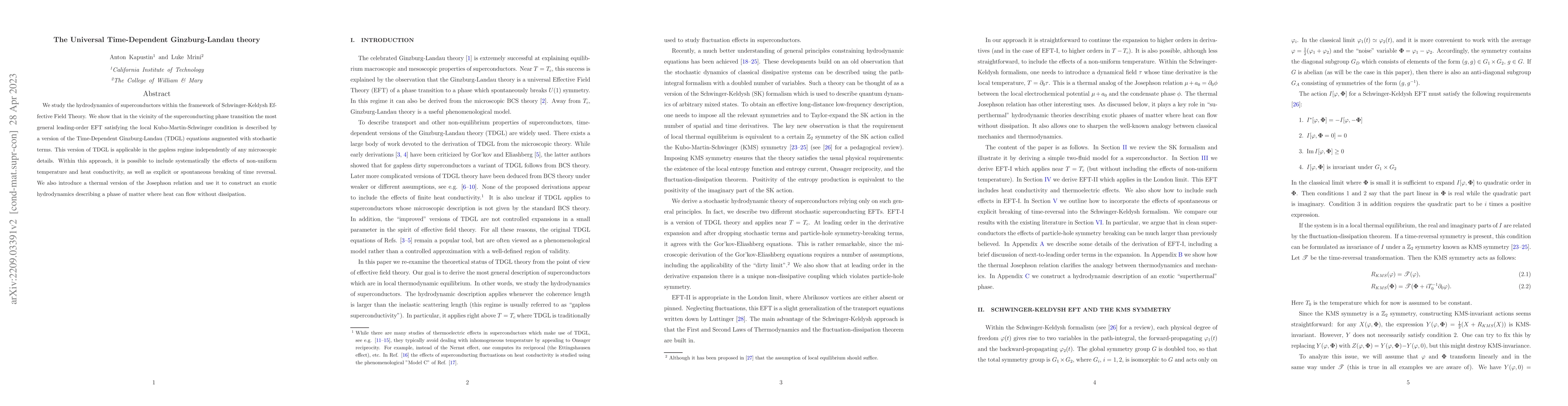We study the hydrodynamics of superconductors within the framework of Schwinger-Keldysh Effective Field Theory. We show that in the vicinity of the superconducting phase transition the most general leading-order EFT satisfying the local Kubo-Martin-Schwinger condition is described by a version of the Time-Dependent Ginzburg-Landau (TDGL) equations augmented with stochastic terms. This version of TDGL is applicable in the gapless regime independently of any microscopic details. Within this approach, it is possible to include systematically the effects of non-uniform temperature and heat conductivity, as well as explicit or spontaneous breaking of time reversal. We also introduce a thermal version of the Josephson relation and use it to construct an exotic hydrodynamics describing a phase of matter where heat can flow without dissipation.