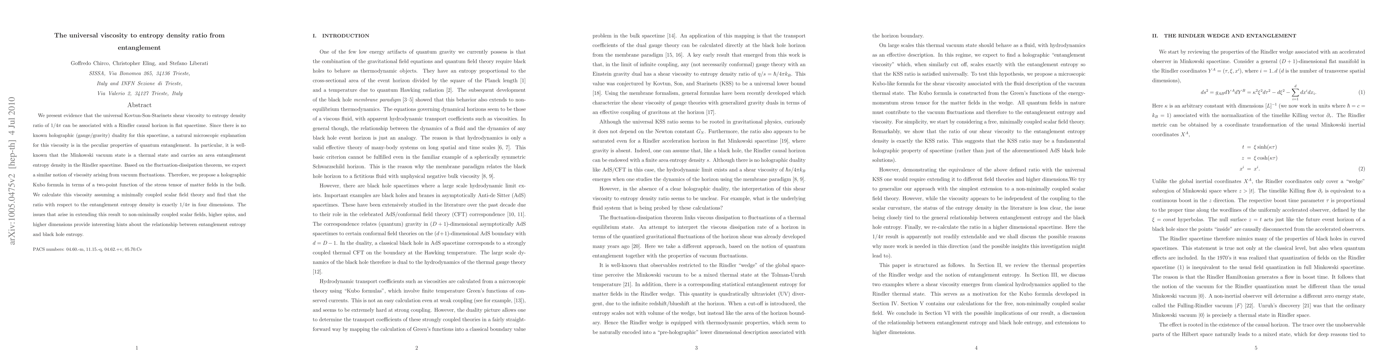 We present evidence that the universal Kovtun-Son-Starinets shear viscosity to entropy density ratio of 1/4\pi can be associated with a Rindler causal horizon in flat spacetime. Since there is no known holographic (gauge/gravity) duality for this spacetime, a natural microscopic explanation for this viscosity is in the peculiar properties of quantum entanglement. In particular, it is well-known that the Minkowski vacuum state is a thermal state and carries an area entanglement entropy density in the Rindler spacetime. Based on the fluctuation-dissipation theorem, we expect a similar notion of viscosity arising from vacuum fluctuations. Therefore, we propose a holographic Kubo formula in terms of a two-point function of the stress tensor of matter fields in the bulk. We calculate this viscosity assuming a minimally coupled scalar field theory and find that the ratio with respect to the entanglement entropy density is exactly 1/4\pi in four dimensions. The issues that arise in extending this result to non-minimally coupled scalar fields, higher spins, and higher dimensions provide interesting hints about the relationship between entanglement entropy and black hole entropy.