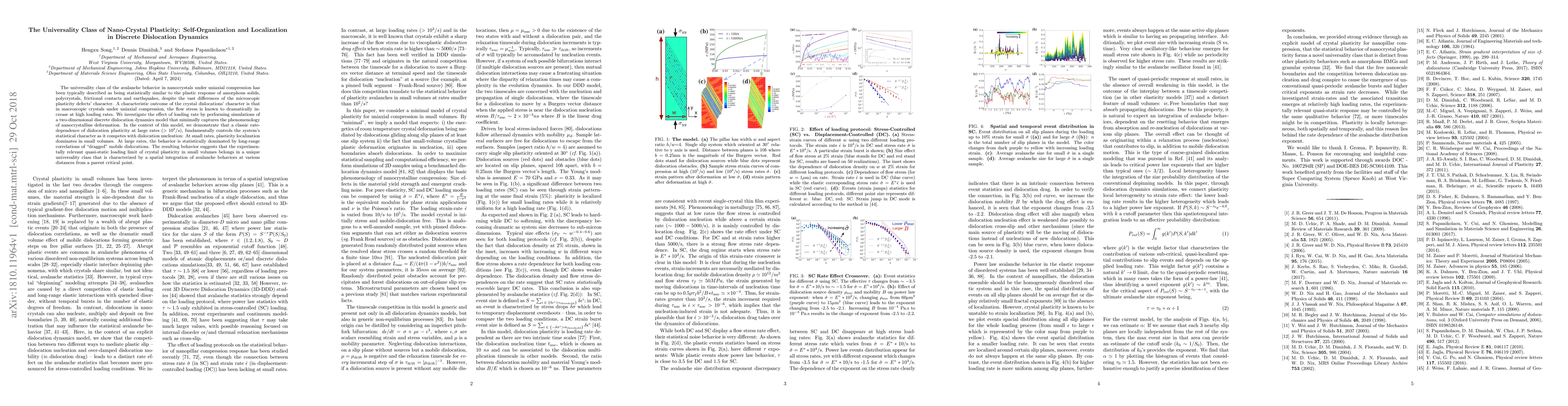This paper explores the universality class of nano-crystalline plasticity through simulations of a two-dimensional discrete dislocation dynamics model. It finds that at high rates, dislocation plasticity is dominated by long-range correlations of mobile dislocations, while at low rates, plasticity is characterized by localization and spatial integration of avalanche behaviors.