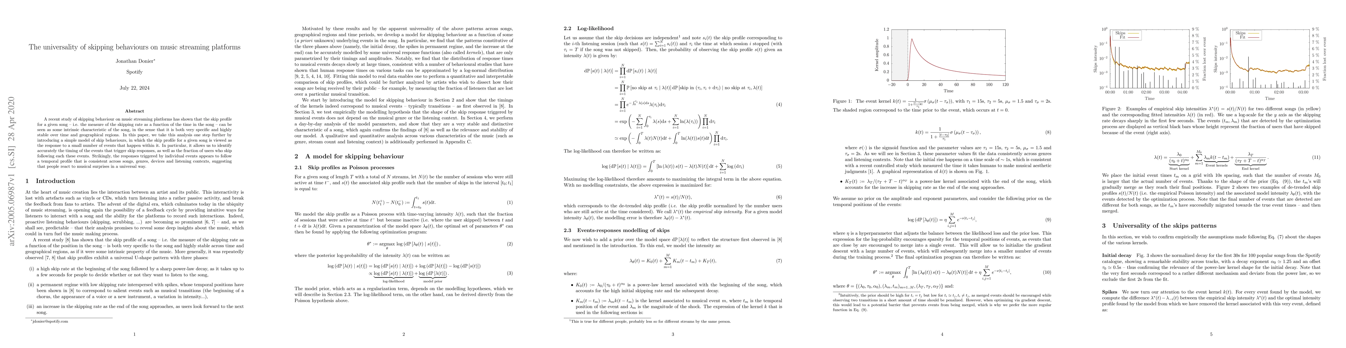 This paper investigates skipping behaviors on music streaming platforms, revealing that skip profiles are intrinsic to songs and remarkably stable over time and geography. It introduces a model identifying event-triggered skip responses, showing that the temporal profiles of these responses are universally consistent across songs, genres, devices, and contexts.