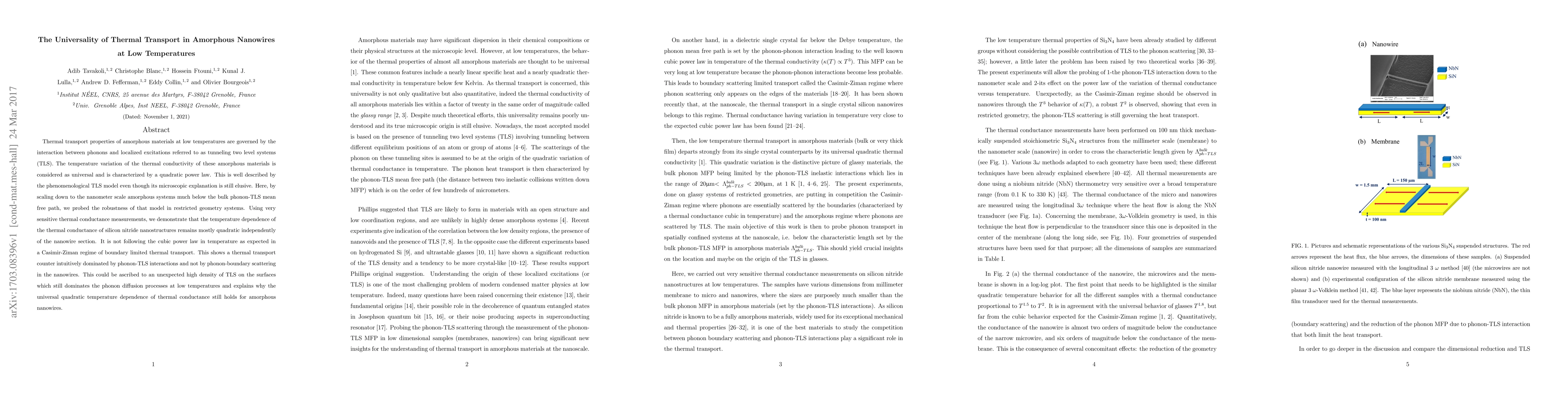 Thermal transport properties of amorphous materials at low temperatures are governed by the interaction between phonons and localized excitations referred to as tunneling two level systems (TLS). The temperature variation of the thermal conductivity of these amorphous materials is considered as universal and is characterized by a quadratic power law. This is well described by the phenomenological TLS model even though its microscopic explanation is still elusive. Here, by scaling down to the nanometer scale amorphous systems much below the bulk phonon-TLS mean free path, we probed the robustness of that model in restricted geometry systems. Using very sensitive thermal conductance measurements, we demonstrate that the temperature dependence of the thermal conductance of silicon nitride nanostructures remains mostly quadratic independently of the nanowire section. It is not following the cubic power law in temperature as expected in a Casimir-Ziman regime of boundary limited thermal transport. This shows a thermal transport counter intuitively dominated by phonon-TLS interactions and not by phonon-boundary scattering in the nanowires. This could be ascribed to an unexpected high density of TLS on the surfaces which still dominates the phonon diffusion processes at low temperatures and explains why the universal quadratic temperature dependence of thermal conductance still holds for amorphous nanowires.