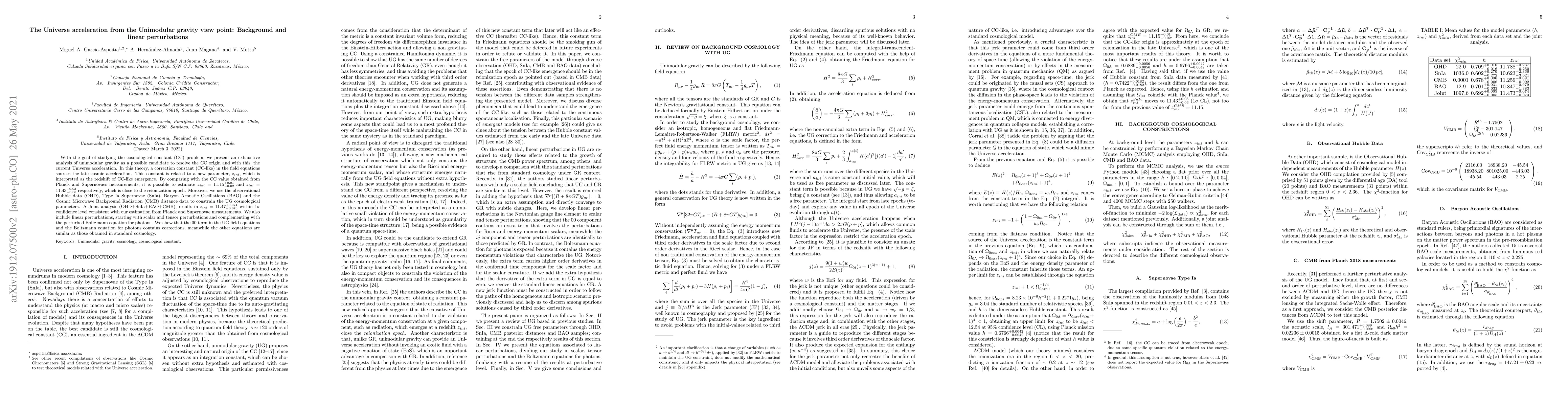 With the goal of studying the cosmological constant (CC) problem, we present an exhaustive analysis of unimodular gravity as a possible candidate to resolve the CC origin and with this, the current Universe acceleration. In this theory, a correction constant (CC-like) in the field equations sources the late cosmic acceleration. This constant is related to a new parameter, $z_{ini}$, which is interpreted as the redshift of CC-like emergence. By comparing with the CC value obtained from Planck and Supernovaes measurements, it is possible to estimate $z_{ini}=11.15^{+0.01}_{-0.02}$ and $z_{ini}=11.43^{+0.03}_{-0.06}$ respectively, which is close to the reionization epoch. Moreover, we use the observational Hubble data (OHD), Type Ia Supernovae (SnIa), Baryon Acoustic Oscillations (BAO) and the Cosmic Microwave Background Radiation (CMB) distance data to constrain the UG cosmological parameters. A Joint analysis (OHD+SnIa+BAO+CMB), results in $z_{ini}=11.47^{+0.074}_{-0.073}$ within $1\sigma$ confidence level consistent with our estimation from Planck and Supernovae measurements. We also include linear perturbations, starting with scalar and tensor perturbations and complementing with the perturbed Boltzmann equation for photons. We show that the $00$ term in the UG field equations and the Boltzmann equation for photons contains corrections, meanwhile the other equations are similar as those obtained in standard cosmology.