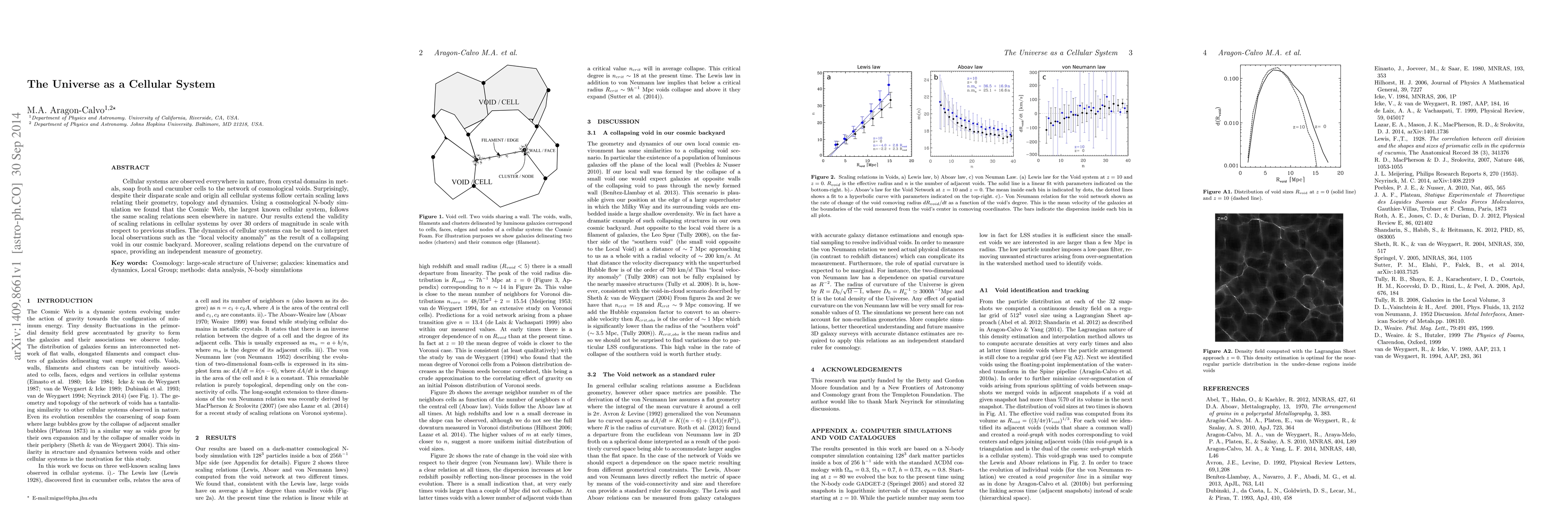 Cellular systems are observed everywhere in nature, from crystal domains in metals, soap froth and cucumber cells to the network of cosmological voids. Surprisingly, despite their disparate scale and origin all cellular systems follow certain scaling laws relating their geometry, topology and dynamics. Using a cosmological N-body simulation we found that the Cosmic Web, the largest known cellular system, follows the same scaling relations seen elsewhere in nature. Our results extend the validity of scaling relations in cellular systems by over 30 orders of magnitude in scale with respect to previous studies. The dynamics of cellular systems can be used to interpret local observations such as the local velocity anomaly as the result of a collapsing void in our cosmic backyard. Moreover, scaling relations depend on the curvature of space, providing an independent measure of geometry.