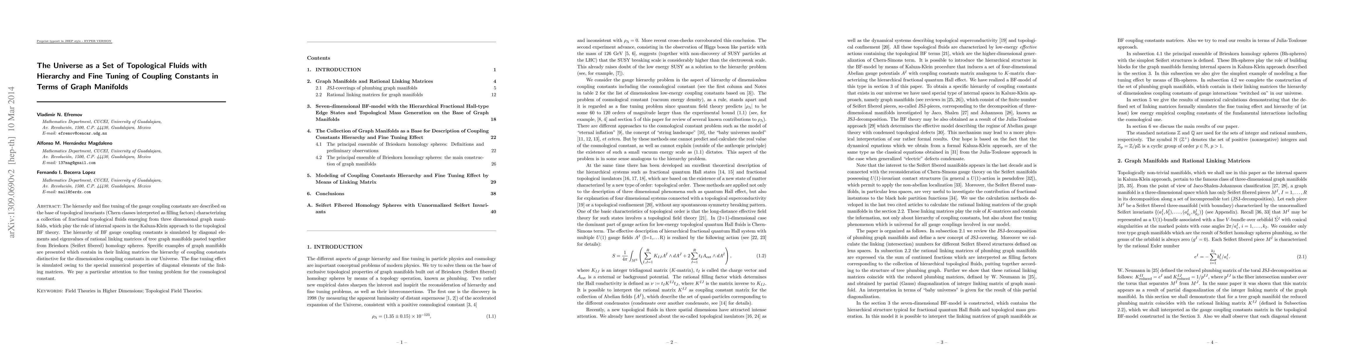 The hierarchy and fine tuning of the gauge coupling constants are described on the base of topological invariants (Chern classes interpreted as filling factors) characterizing a collection of fractional topological fluids emerging from three dimensional graph manifolds, which play the role of internal spaces in the Kaluza-Klein approach to the topological BF theory. The hierarchy of BF gauge coupling constants is simulated by diagonal elements and eigenvalues of rational linking matrices of tree graph manifolds pasted together from Brieskorn (Seifert fibered) homology spheres. Specific examples of graph manifolds are presented which contain in their linking matrices the hierarchy of coupling constants distinctive for the dimensionless coupling constants in our Universe. The fine tuning effect is simulated owing to the special numerical properties of diagonal elements of the linking matrices. We pay a particular attention to fine tuning problem for the cosmological constant and propose its model solution.