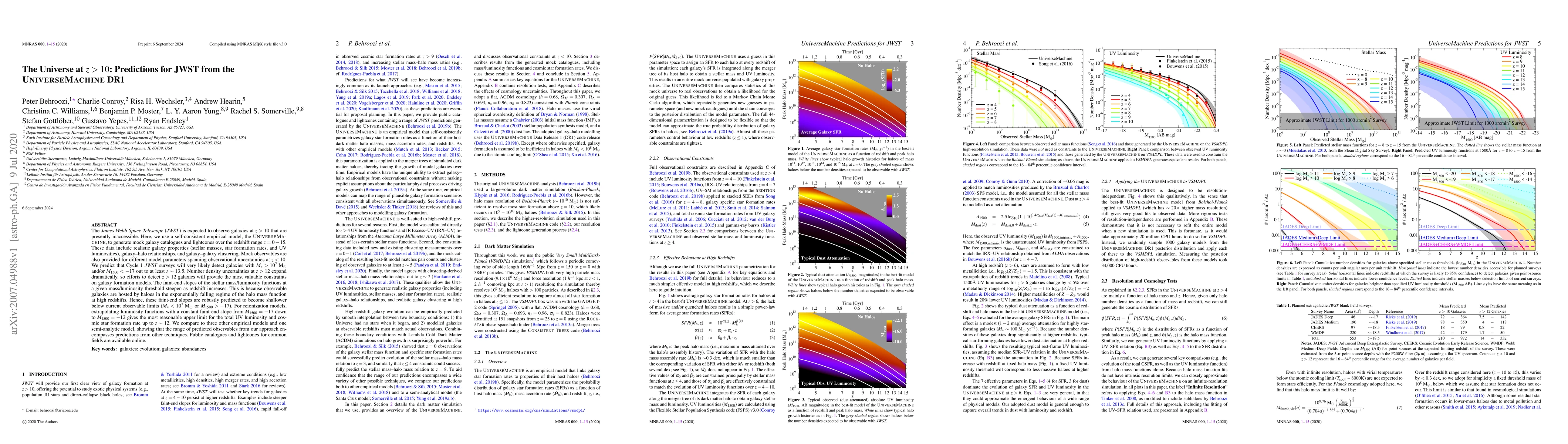 The James Webb Space Telescope (JWST) is expected to observe galaxies at $z>10$ that are presently inaccessible. Here, we use a self-consistent empirical model, the UniverseMachine, to generate mock galaxy catalogues and lightcones over the redshift range $z=0-15$. These data include realistic galaxy properties (stellar masses, star formation rates, and UV luminosities), galaxy-halo relationships, and galaxy-galaxy clustering. Mock observables are also provided for different model parameters spanning observational uncertainties at $z<10$. We predict that Cycle 1 JWST surveys will very likely detect galaxies with $M_*>10^7 M_\odot$ and/or $M_{1500}<-17$ out to at least $z\sim 13.5$. Number density uncertainties at $z>12$ expand dramatically, so efforts to detect $z>12$ galaxies will provide the most valuable constraints on galaxy formation models. The faint-end slopes of the stellar mass/luminosity functions at a given mass/luminosity threshold steepen as redshift increases. This is because observable galaxies are hosted by haloes in the exponentially falling regime of the halo mass function at high redshifts. Hence, these faint-end slopes are robustly predicted to become shallower below current observable limits ($M_\ast < 10^7M_\odot$ or $M_\mathrm{1500}>-17$). For reionization models, extrapolating luminosity functions with a constant faint-end slope from $M_{1500}=-17$ down to $M_{1500}=-12$ gives the most reasonable upper limit for the total UV luminosity and cosmic star formation rate up to $z\sim 12$. We compare to three other empirical models and one semi-analytic model, showing that the range of predicted observables from our approach encompasses predictions from other techniques. Public catalogues and lightcones for common fields are available online.