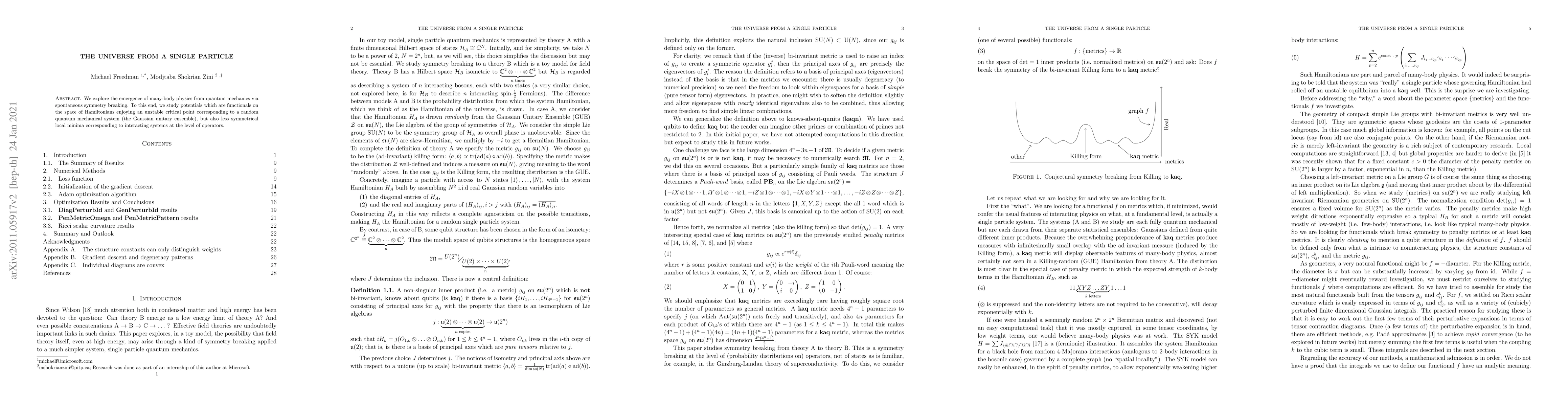 We explore the emergence of many-body physics from quantum mechanics via spontaneous symmetry breaking. To this end, we study potentials which are functionals on the space of Hamiltonians enjoying an unstable critical point corresponding to a random quantum mechanical system (the Gaussian unitary ensemble), but also less symmetrical local minima corresponding to interacting systems at the level of operators.