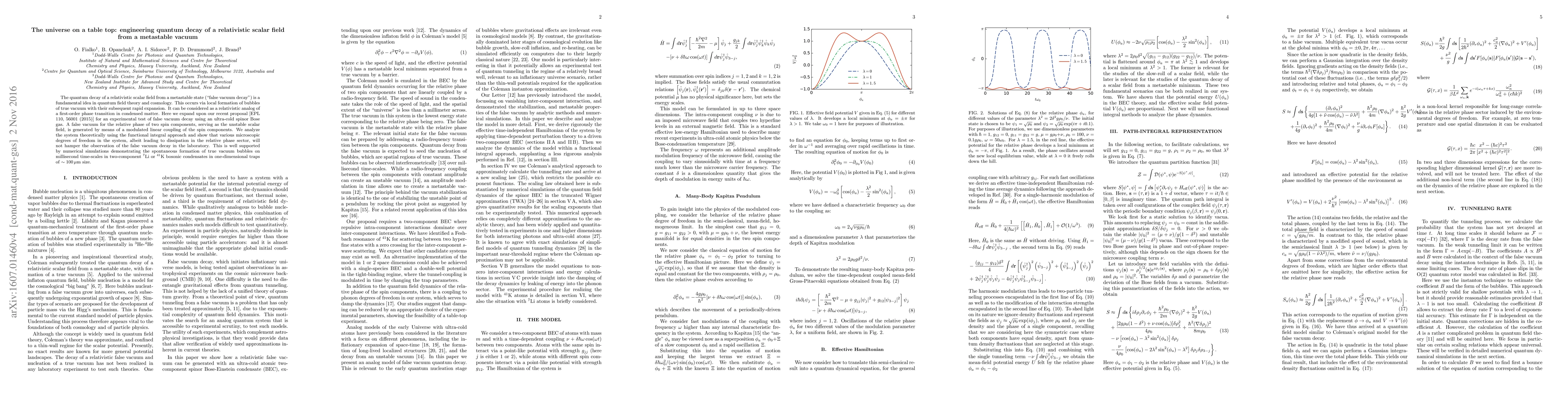 The quantum decay of a relativistic scalar field from a metastable state ("false vacuum decay") is a fundamental idea in quantum field theory and cosmology. This occurs via local formation of bubbles of true vacuum with their subsequent rapid expansion. It can be considered as a relativistic analog of a first-order phase transition in condensed matter. Here we expand upon our recent proposal [EPL 110, 56001 (2015)] for an experimental test of false vacuum decay using an ultra-cold spinor Bose gas. A false vacuum for the relative phase of two spin components, serving as the unstable scalar field, is generated by means of a modulated linear coupling of the spin components. We analyze the system theoretically using the functional integral approach and show that various microscopic degrees of freedom in the system, albeit leading to dissipation in the relative phase sector, will not hamper the observation of the false vacuum decay in the laboratory. This is well supported by numerical simulations demonstrating the spontaneous formation of true vacuum bubbles on millisecond time-scales in two-component $^{7}$Li or $^{41}$K bosonic condensates in one-dimensional traps of $\sim100\,\mu \mathrm{m}$ size.