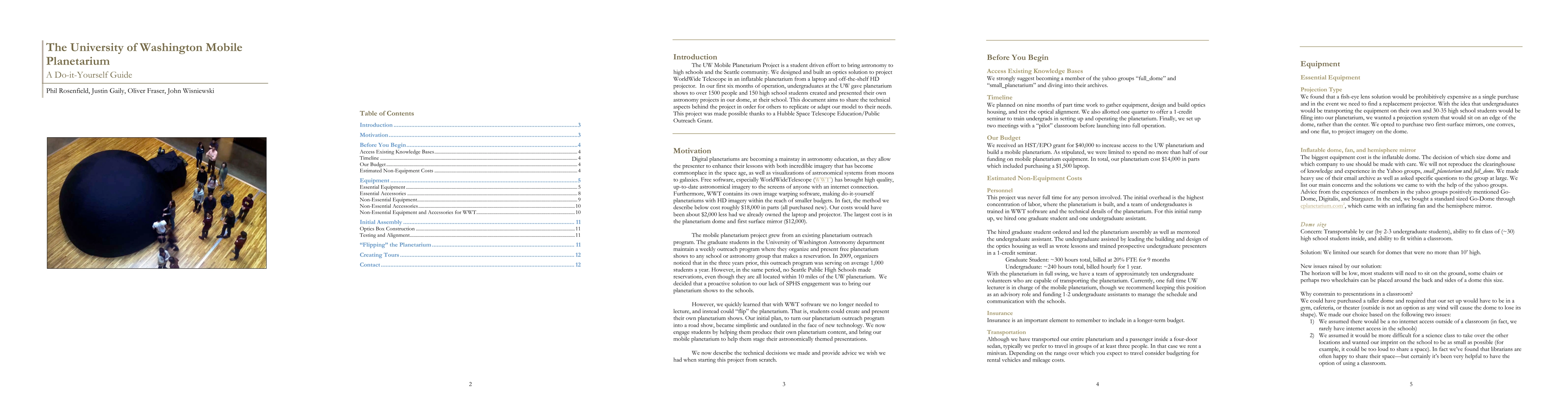 The University of Washington Mobile Planetarium Project enables high school students and community members to experience astronomy through a student-driven inflatable planetarium. The project shares technical details to help others replicate or adapt the model, supported by a Hubble Space Telescope Education/Public Outreach Grant.