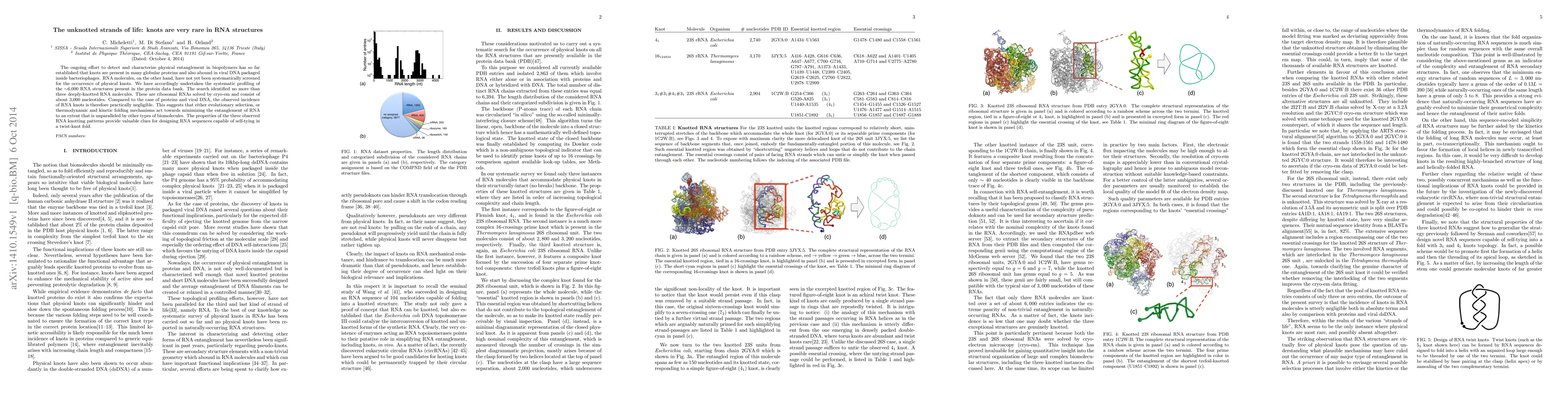 The ongoing effort to detect and characterize physical entanglement in biopolymers has so far established that knots are present in many globular proteins and also abound in viral DNA packaged inside bacteriophages. RNA molecules, on the other hand, have not yet been systematically screened for the occurrence of physical knots. We have accordingly undertaken the systematic profiling of the ~6,000 RNA structures present in the protein data bank. The search identified no more than three deeply-knotted RNA molecules. These are ribosomal RNAs solved by cryo-em and consist of about 3,000 nucleotides. Compared to the case of proteins and viral DNA, the observed incidence of RNA knots is therefore practically negligible. This suggests that either evolutionary selection, or thermodynamic and kinetic folding mechanisms act towards minimizing the entanglement of RNA to an extent that is unparalleled by other types of biomolecules. The properties of the three observed RNA knotting patterns provide valuable clues for designing RNA sequences capable of self-tying in a twist-knot fold.