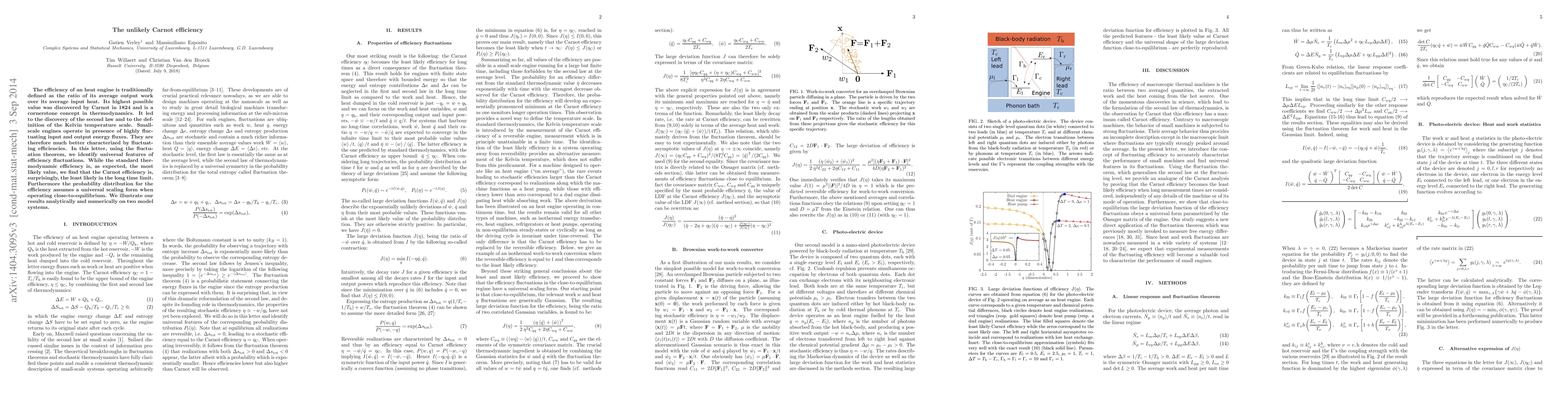 The efficiency of an heat engine is traditionally defined as the ratio of its average output work over its average input heat. Its highest possible value was discovered by Carnot in 1824 and is a cornerstone concept in thermodynamics. It led to the discovery of the second law and to the definition of the Kelvin temperature scale. Small-scale engines operate in the presence of highly fluctuating input and output energy fluxes. They are therefore much better characterized by fluctuating efficiencies. In this study, using the fluctuation theorem, we identify universal features of efficiency fluctuations. While the standard thermodynamic efficiency is, as expected, the most likely value, we find that the Carnot efficiency is, surprisingly, the least likely in the long time limit. Furthermore the probability distribution for the efficiency assumes a universal scaling form when operating close-to-equilibrium. We illustrate our results analytically and numerically on two model systems.