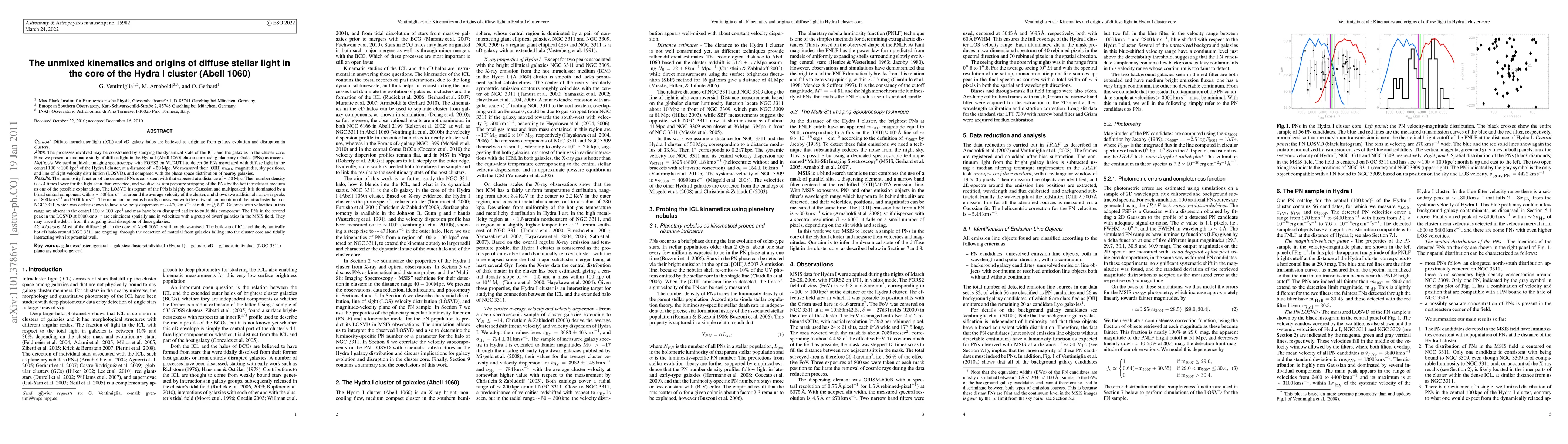 Diffuse intracluster light (ICL) and cD galaxy halos are believed to originate from galaxy evolution and disruption. We present a kinematic study of the ICL in the Hydra I cluster core, using planetary nebulas (PNs) as tracers. We used multi-slit imaging spectroscopy with FORS2 on VLT-UT1 to detect 56 PNs associated with diffuse light in the central 100 x 100 kpc^2 of Hydra I. We measured their [OIII] magnitudes, sky positions, and velocity distribution (LOSVD), and compared with the phase-space distribution of nearby galaxies. The luminosity function of the detected PNs is consistent with that expected at a distance of ~50 Mpc. Their number density is ~4 times lower for the light seen than expected, and we discuss ram pressure stripping of the PNs by the hot ICM as one of the possible explanations. The LOSVD histogram of the PNs is highly non-Gaussian and multipeaked: it is dominated by a broad central component with sigma~500 km/s at around the average velocity of the cluster, and shows two additional narrower peaks at 1800 km/s and 5000 km/s. The main component is broadly consistent with the outward continuation of the intracluster halo of NGC 3311, which was earlier shown to have a velocity dispersion of ~470 km/s at radii of >50". Galaxies with velocities in this range are absent in the central 100 x 100 kpc^2 and may have been disrupted earlier to build this component. The PNs in the second peak in the LOSVD at 5000 km/s are coincident spatially and in velocities with a group of dwarf galaxies in the MSIS field. They may trace the debris from the ongoing tidal disruption of these galaxies. Most of the diffuse light in the core of Hydra is still not phase-mixed. The build-up of ICL and the dynamically hot cD halo around NGC 3311 are ongoing, through the accretion of material from galaxies falling into the cluster core and tidally interacting with its potential well.