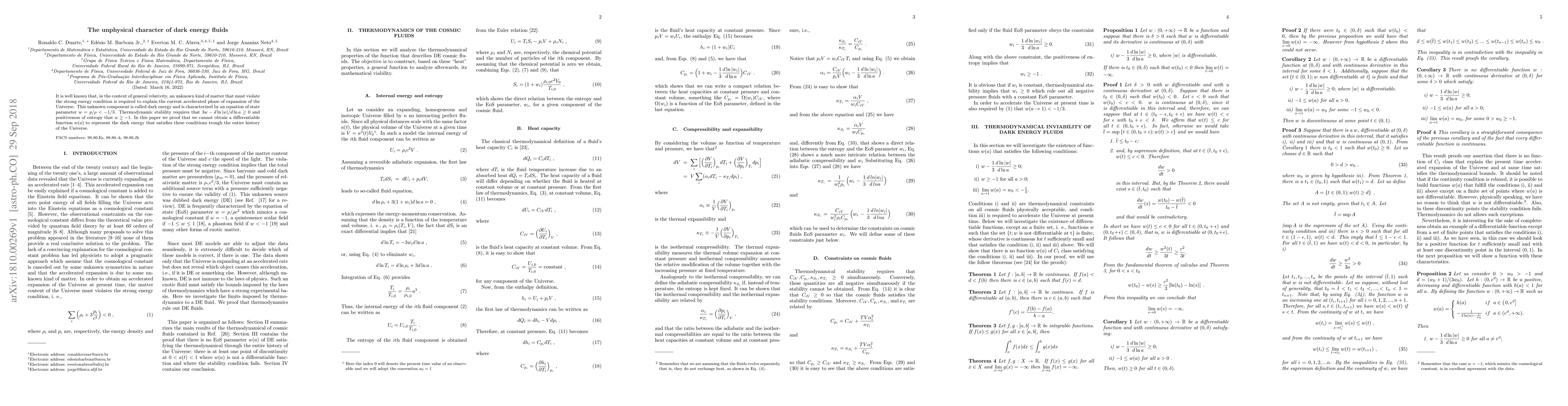 It is well known that, in the context of general relativity, an unknown kind of matter that must violate the strong energy condition is required to explain the current accelerated phase of expansion of the Universe. This unknown component is called dark energy and is characterized by an equation of state parameter $w=p/\rho<-1/3$. Thermodynamic stability requires that $3w-d\ln |w|/d\ln a\ge0$ and positiveness of entropy that $w\ge-1$. In this paper we proof that we cannot obtain a differentiable function $w(a)$ to represent the dark energy that satisfies these conditions trough the entire history of the Universe.