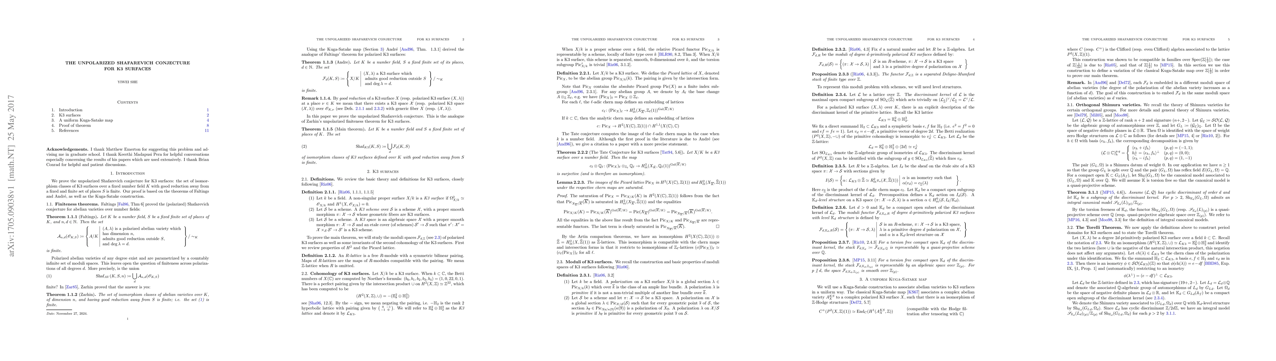 The paper proves the unpolarized Shafarevich conjecture for K3 surfaces, demonstrating that K3 surfaces over a fixed number field with good reduction away from a finite set of places are finite in number. The proof utilizes theorems by Faltings, André, and the Kuga-Satake construction.
