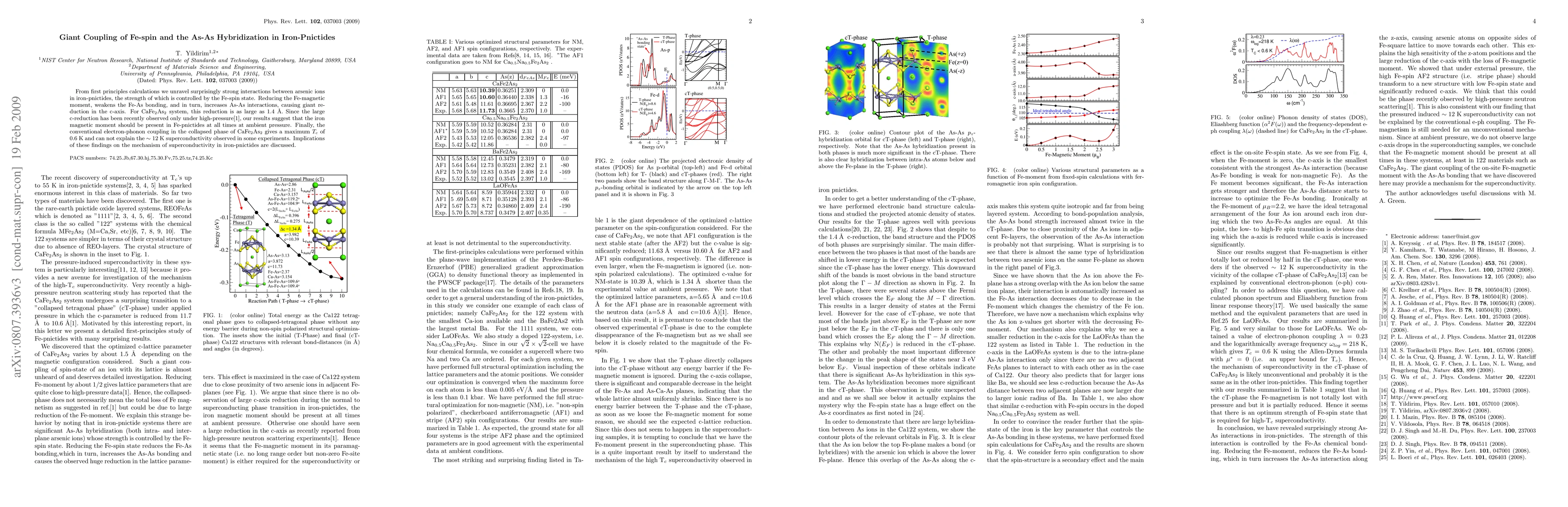 From first principles calculations we unravel surprisingly strong interactions between arsenic ions in iron-pnictides, the strength of which is controlled by the Fe-spin state. Reducing the Fe-magnetic moment, weakens the Fe-As bonding, and in turn, increases As-As interactions, causing giant reduction in the c-axis. For CaFe$_2$As$_2$ system, this reduction is as large as 1.4 \AA. Since the large c-reduction has been recently observed only under high-pressure\cite{cTphase}, our results suggest that the iron magnetic moment should be present in Fe-pnictides at all times at ambient pressure. Finally, the conventional electron-phonon coupling in the collapsed phase of CaFe$_2$As$_2$ gives a maximum $T_c$ of 0.6 K and can not explain the $\sim12$ K superconductivity observed in some experiments. Implications of these findings on the mechanism of superconductivity in iron-pnictides are discussed.