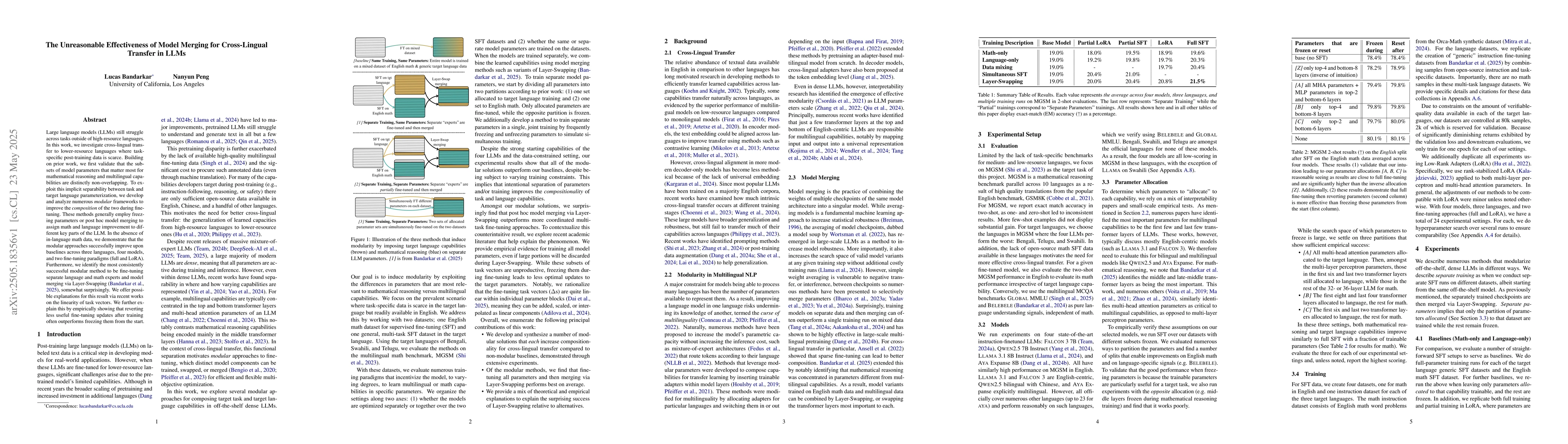 The paper introduces modular frameworks for fine-tuning LLMs that separate language and task (math) parameterization, employing freezing and model merging techniques to improve cross-lingual transfer in lower-resource languages.