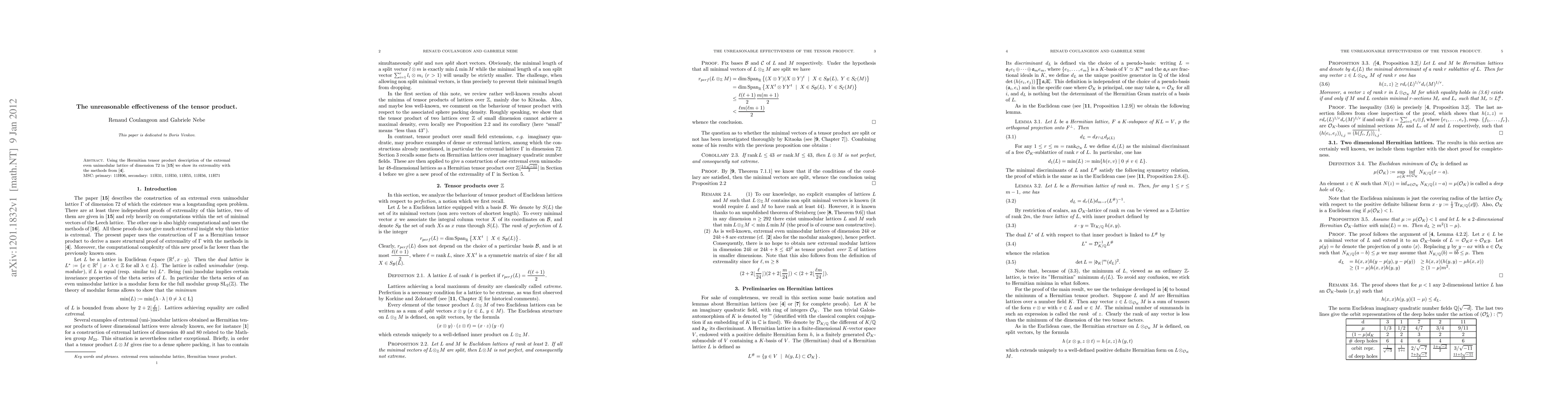 Using the Hermitian tensor product description of the extremal even unimodular lattice of dimension 72 found by Nebe in 2010 we show its extremality with the methods from Coulangeons article in Acta Arith. 2000.