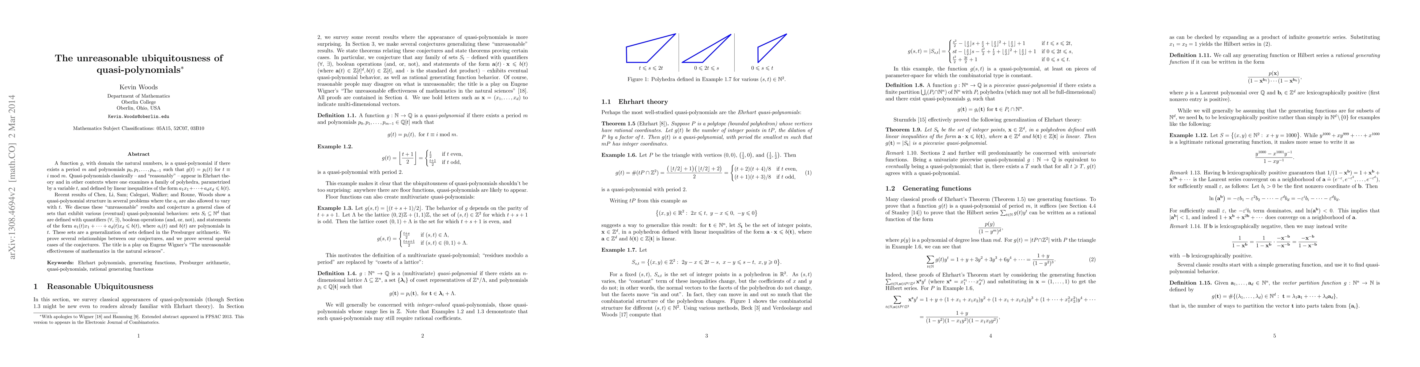 A function g, with domain the natural numbers, is a quasi-polynomial if there exists a period m and polynomials p_0,p_1,...,p_{m-1} such that g(t)=p_i(t) for t=i mod m. Quasi-polynomials classically -- and "reasonably" -- appear in Ehrhart theory and in other contexts where one examines a family of polyhedra, parametrized by a variable t, and defined by linear inequalities of the form a_1x_1+...+a_dx_d <= b(t). Recent results of Chen, Li, Sam; Calegari, Walker; and Roune, Woods show a quasi-polynomial structure in several problems where the a_i are also allowed to vary with t. We discuss these "unreasonable" results and conjecture a general class of sets that exhibit various (eventual) quasi-polynomial behaviors: sets S_t of d-tuples of natural numbers that are defined with quantifiers ("for all", "there exists"), boolean operations (and, or, not), and statements of the form a_1(t)x_1+...+a_d(t)x_d <= b(t), where a_i(t) and b(t) are polynomials in t. These sets are a generalization of sets defined in the Presburger arithmetic. We prove several relationships between our conjectures, and we prove several special cases of the conjectures. The title is a play on Eugene Wigner's "The unreasonable effectiveness of mathematics in the natural sciences''.
