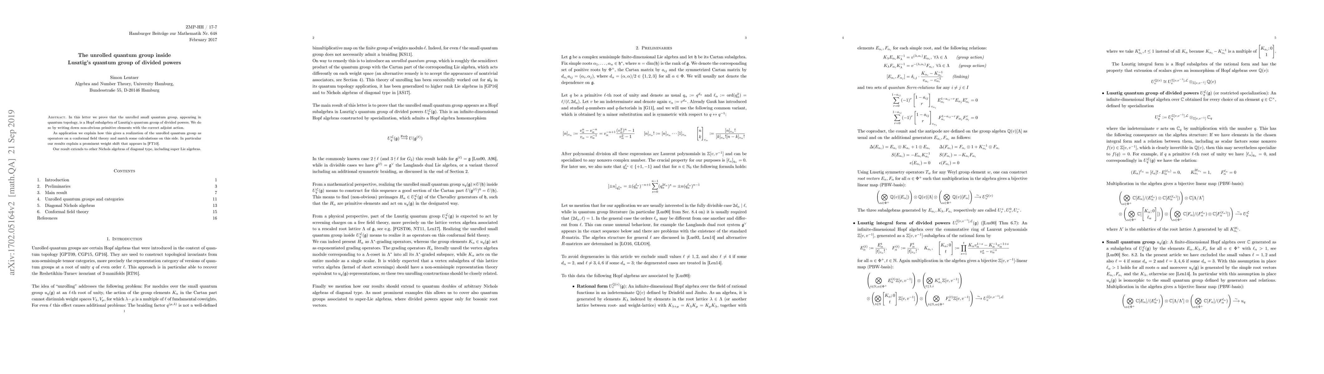 In this letter we prove that the unrolled small quantum group, appearing in quantum topology, is a Hopf subalgebra of Lusztig's quantum group of divided powers. We do so by writing down non-obvious primitive elements with the correct adjoint action. As application we explain how this gives a realization of the unrolled quantum group as operators on a conformal feld theory and match some calculations on this side. In particular our results explain a prominent weight shift that appears in [FT10]. Our result extends to other Nichols algebras of diagonal type, including super Lie algebras.