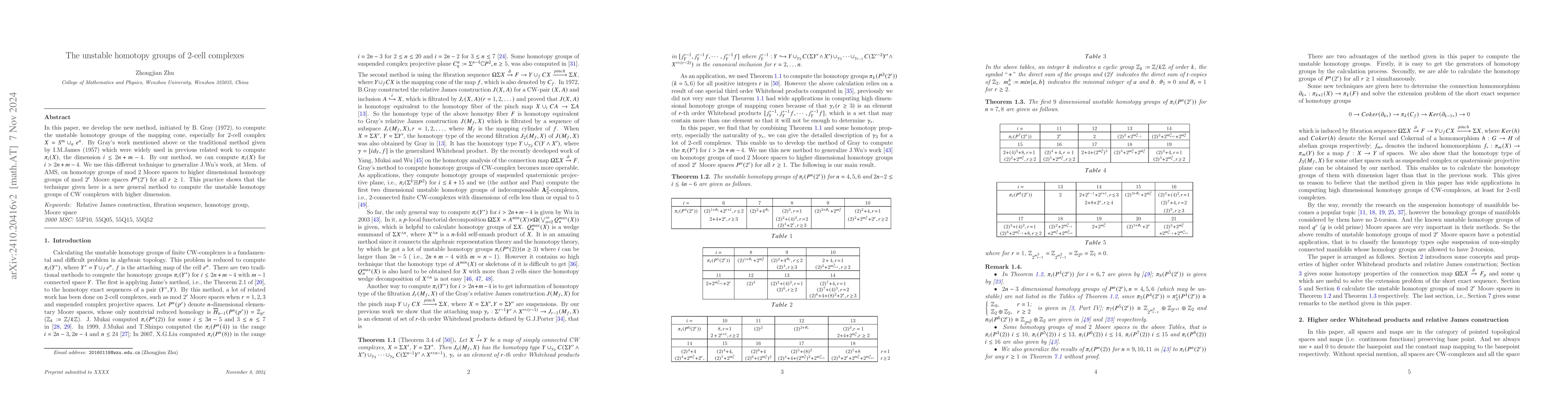 In this paper, we develop the new method, initiated by B. Gray (1972), to compute the unstable homotopy groups of the mapping cone, especially for $2$-cell complex $X=S^m\cup_{\alpha} e^{n}$. By Gray's work mentioned above or the traditional method given by I.M.James (1957) which were widely used in previous related work to compute $\pi_{i}(X)$, the dimension $i\leq 2n+m-4$. By our method, we can compute $\pi_{i}(X)$ for $i>2n+m-4$. We use this different technique to generalize J.Wu's work, at Mem. of AMS, on homotopy groups of mod $2$ Moore spaces to higher dimensional homotopy groups of mod $2^r$ Moore spaces $P^{n}(2^r)$ for all $r\geq 1$. This practice shows that the technique given here is a new general method to compute the unstable homotopy groups of CW complexes with higher dimension.