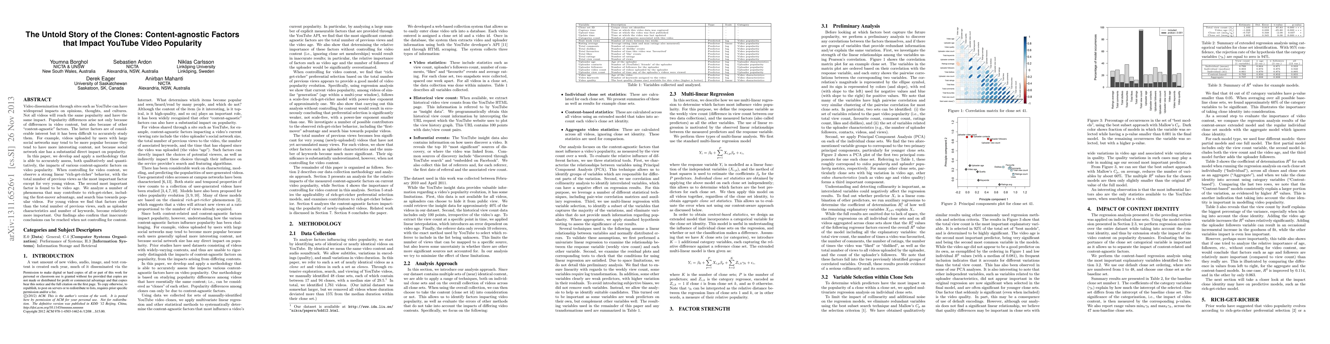 This paper investigates how "content-agnostic" factors influence YouTube video popularity, beyond the video content itself. It finds a strong "rich-get-richer" effect, where videos with more views tend to gain more views, with previous view count and video age being the most significant factors. For young videos, uploader characteristics and keyword usage play a larger role. The study emphasizes the importance of controlling for video content when analyzing popularity.