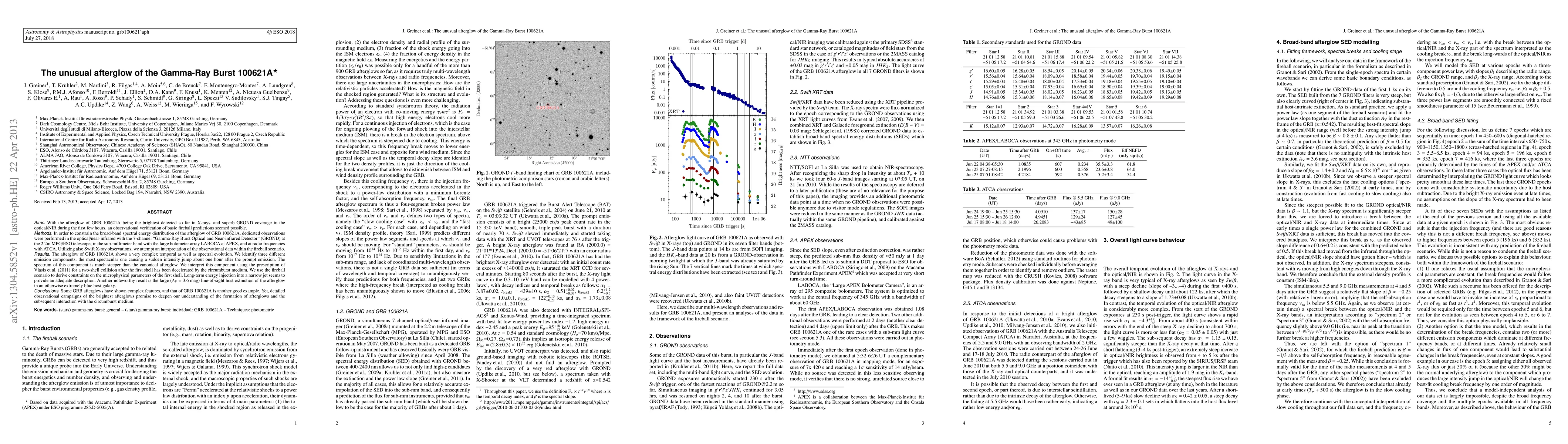 The afterglow of Gamma-Ray Burst 100621A exhibits complex temporal and spectral evolution, including a sudden intensity jump an hour post-burst. This is interpreted through a two-shell collision model, suggesting long-term energy injection into a narrow jet, and revealing significant host extinction.