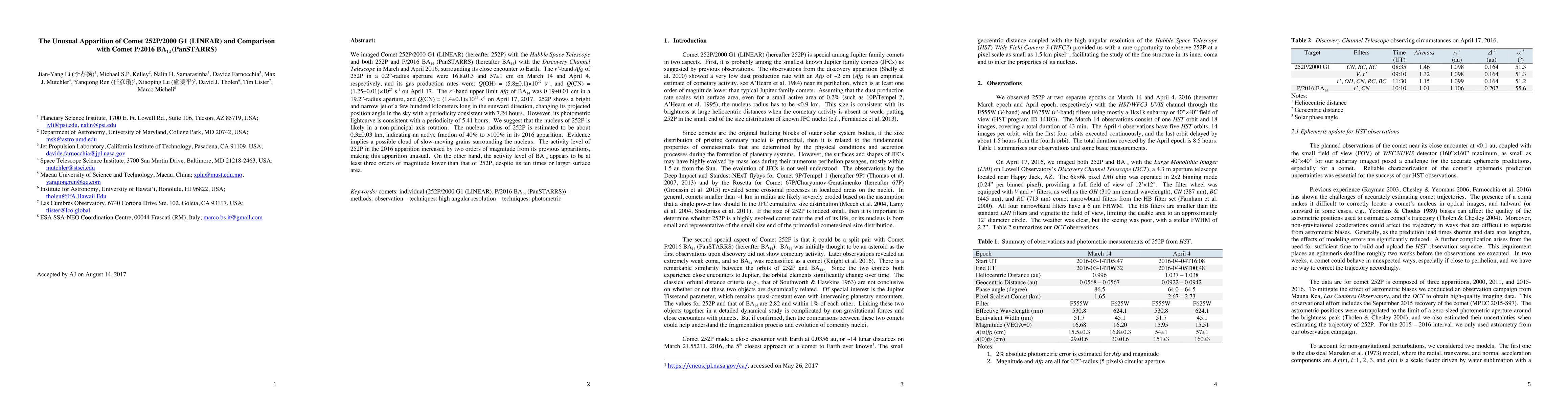 We imaged Comet 252P/2000 G1 (LINEAR) (hereafter 252P) with the Hubble Space Telescope and both 252P and P/2016 BA$_{14}$ (PanSTARRS) (hereafter BA$_{14}$) with the Discovery Channel Telescope in March and April 2016, surrounding its close encounter to Earth. The r'-band $Af\rho$ of 252P in a 0.2"-radius aperture were $16.8\pm0.3$ and $57\pm1$ cm on March 14 and April 4, respectively, and its gas production rates were: $Q$(OH) = $(5.8\pm0.1)\times10^{27}$ s$^{-1}$, and $Q$(CN) = $(1.25\pm0.01)\times10^{25}$ s$^{-1}$ on April 17. The r'-band upper limit $Af\rho$ of BA1$_{14}$ was $0.19\pm0.01$ cm in a 19.2"-radius aperture, and $Q$(CN) = $(1.4\pm0.1)10^{22}$ s$^{-1}$ on April 17, 2017. 252P shows a bright and narrow jet of a few hundred kilometers long in the sunward direction, changing its projected position angle in the sky with a periodicity consistent with 7.24 hours. However, its photometric lightcurve is consistent with a periodicity of 5.41 hours. We suggest that the nucleus of 252P is likely in a non-principal axis rotation. The nucleus radius of 252P is estimated to be about $0.3\pm0.03$ km, indicating an active fraction of 40% to >100% in its 2016 apparition. Evidence implies a possible cloud of slow-moving grains surrounding the nucleus. The activity level of 252P in the 2016 apparition increased by two orders of magnitude from its previous apparitions, making this apparition unusual. On the other hand, the activity level of BA14 appears to be at least three orders of magnitude lower than that of 252P, despite its ten times or larger surface area.