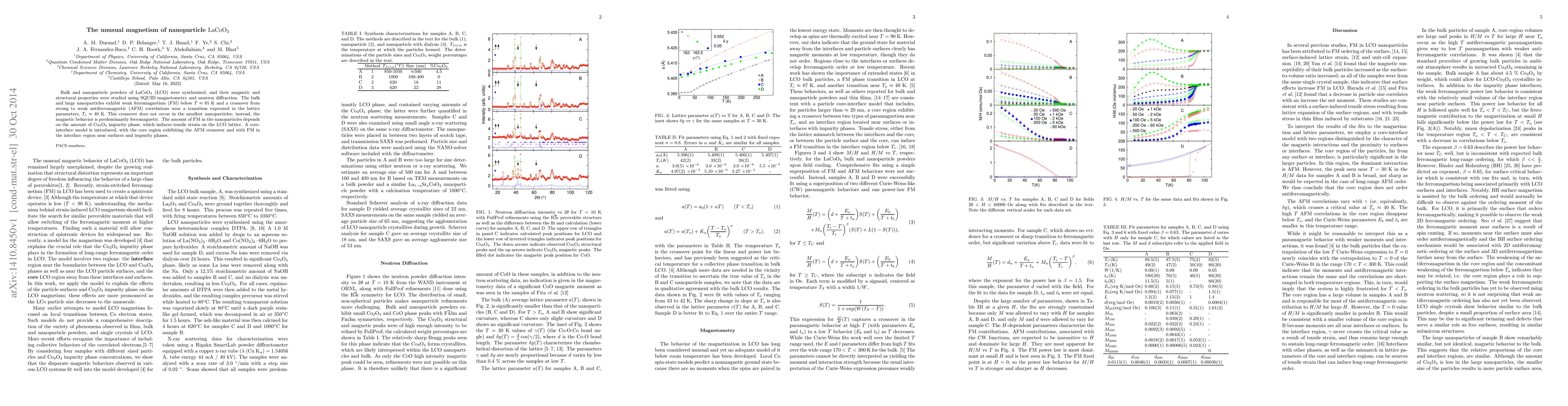 Bulk and nanoparticle powders of LaCoO3 (LCO) were synthesized, and their magnetic and structural properties were studied using SQUID magnetometry and neutron diffraction. The bulk and large nanoparticles exhibit weak ferromagnetism (FM) below T ~ 85K and a crossover from strong to weak antiferromagnetic (AFM) correlations near a transition expressed in the lattice parameters, To ~ 40K. This crossover does not occur in the smallest nanoparticles; instead, the magnetic behavior is predominantly ferromagnetic. The amount of FM in the nanoparticles depends on the amount of Co3O4 impurity phase, which induces tensile strain on the LCO lattice. A core-interface model is introduced, with the core region exhibiting the AFM crossover and with FM in the interface region near surfaces and impurity phases.