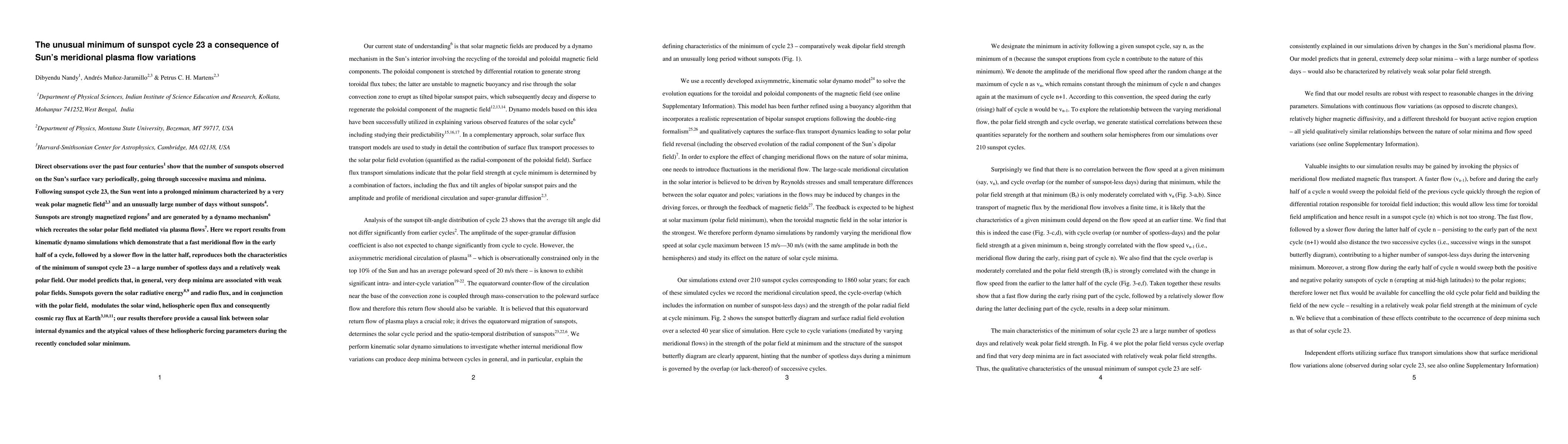 Research suggests that a fast meridional flow in sunspots causes prolonged minima with weak polar magnetic fields, as seen in solar cycle 23.