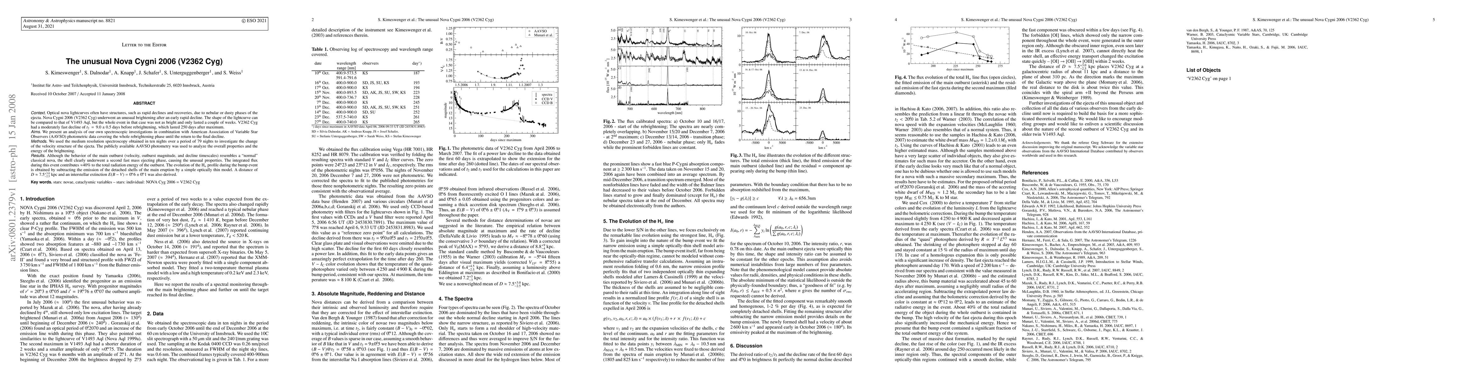 Nova Cygni 2006 (V2362 Cyg) exhibited an unusual brightening after a rapid decline, with a secondary fast mass ejecting phase contributing ~40% to the total radiation energy. Spectroscopic analysis revealed changes in the velocity structure of the ejecta, while photometric data confirmed the event's distinct lightcurve shape.