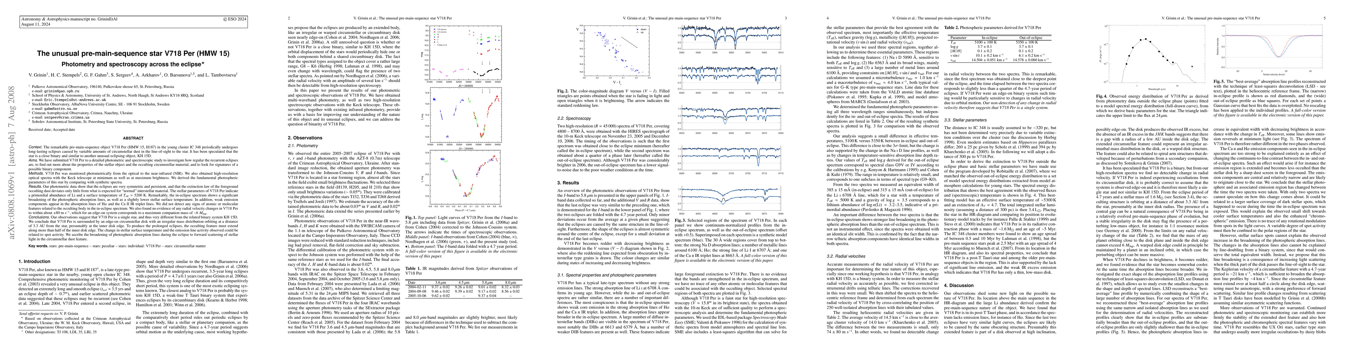 The remarkable pre-main-sequence object V718 Per (HMW 15, H187) in the young cluster IC 348 periodically undergoes long-lasting eclipses caused by variable amounts of circumstellar dust in the line-of-sight to the star. It has been speculated that the star is a close binary and similar to another unusual eclipsing object, KH 15D. We have submitted V718 Per to a detailed photometric and spectroscopic study to find out more about the properties of the stellar object and the occulting circumstellar material, and to look for signatures of a possible binary component. Our photometric data show that the eclipses are very symmetric and persistent, and that the extinction deviates only little from what is expected for normal interstellar material. The spectroscopic data, obtained at minimum as well as at maximum brightness, indicate a primordial abundance of Li and a surface effective temperature of about 5200 K. Remarkably, the in-eclipse spectrum shows a significant broadening of the photospheric absorption lines, as well as a weak increase in emission components of H-alpha and the Ca II IR triplet. We did not detect any atomic or molecular features from to the occulting body in the in-eclipse spectrum. We also found no evidence of radial velocity changes in V718 Per to within about +/- 80 m/s, which for an edge-on system corresponds to a maximum companion mass of 6 Jupiter masses. Our observations suggest that V718 Per is a single star, and thus very different from KH 15D. We conclude that V718 Per is surrounded by an edge-on circumstellar disk with an irregular mass distribution orbiting at a distance of 3.3 AU from the star, presumably at the inner disk edge. We ascribe the broadening of photospheric absorption lines during the eclipse to forward scattering of stellar light in the circumstellar dust feature.