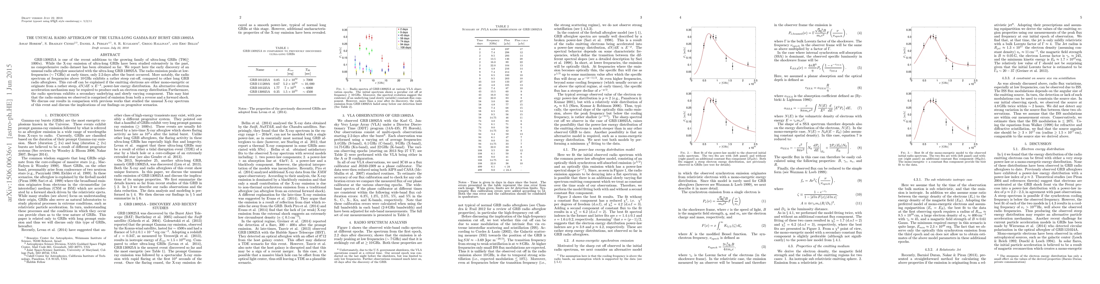 GRB 130925A is one of the recent additions to the growing family of ultra-long GRBs (T90$ \gtrsim 1000$ s). While the X-ray emission of ultra-long GRBs have been studied extensively in the past, no comprehensive radio dataset has been obtained so far. We report here the early discovery of an unusual radio afterglow associated with the ultra-long GRB 130925A. The radio emission peaks at low-frequencies ($\sim 7$ GHz) at early times, only $2.2$ days after the burst occurred. More notably, the radio spectrum at frequencies above $10$ GHz exhibits a rather steep cut-off, compared to other long GRB radio afterglows. This cut-off can be explained if the emitting electrons are either mono-energetic or originate from a rather steep, $dN/dE \propto E^{-4}$, power-law energy distribution. An alternative electron acceleration mechanism may be required to produce such an electron energy distribution. Furthermore, the radio spectrum exhibits a secondary underlying and slowly varying component. This may hint that the radio emission we observed is comprised of emission from both a reverse and a forward shock. We discuss our results in comparison with previous works that studied the unusual X-ray spectrum of this event and discuss the implications of our findings on progenitor scenarios.