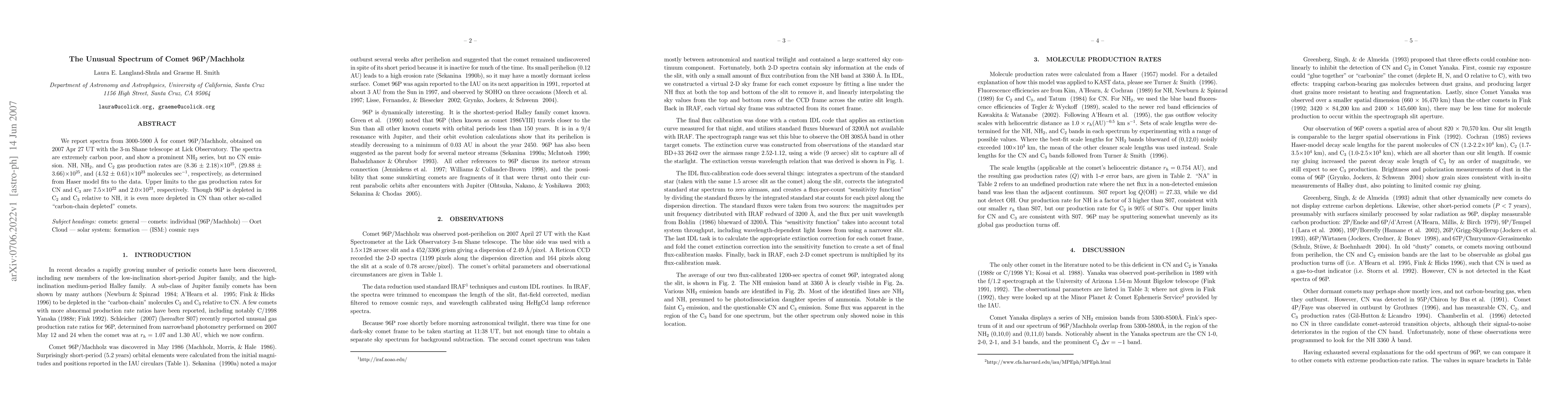 We report spectra from 3000-5900 A for comet 96P/Machholz, obtained on 2007 Apr 27 UT with the 3-m Shane telescope at Lick Observatory. The spectra are extremely carbon poor, and show a prominent NH_2 series, but no CN emission. NH, NH_2, and C_2 gas production rates are (8.36 +/- 2.18)x10^25, (29.88 +/- 3.66)x10^25, and (4.52 +/- 0.61)x10^23 molecules sec^-1, respectively, as determined from Haser model fits to the data. Upper limits to the gas production rates for CN and C_3 are 7.5x10^22 and 2.0x10^23, respectively. Though 96P is depleted in C_2 and C_3 relative to NH, it is even more depleted in CN than other so-called "carbon-chain depleted" comets.