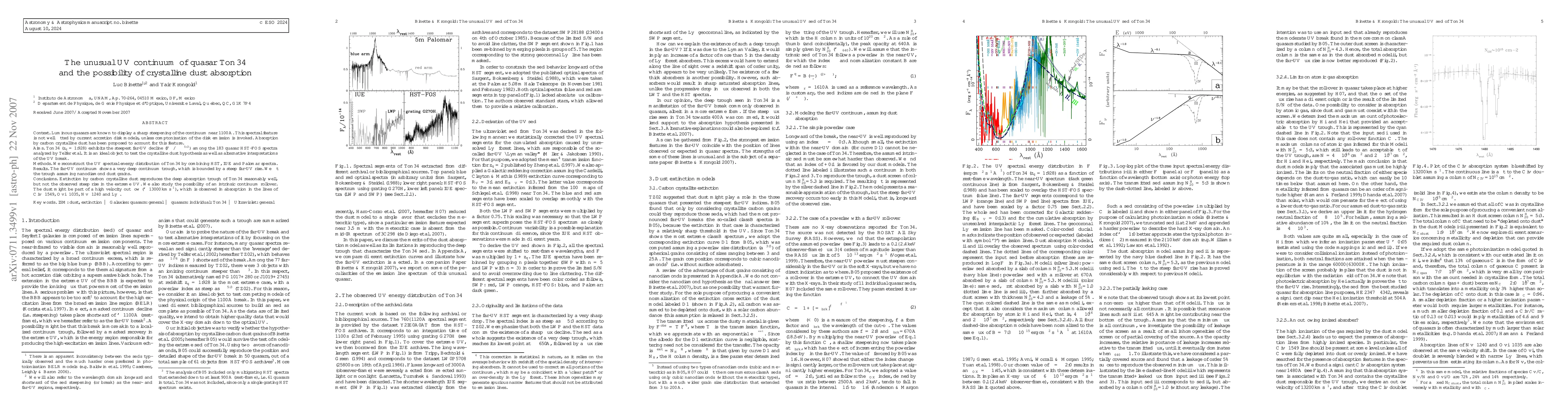 This paper investigates the unusual UV continuum of quasar Ton 34, proposing that absorption by carbon crystalline dust could explain the sharp steepening near 1100A. The study finds that while crystalline dust can reproduce the deep absorption trough, it fails to account for the steep rise in the extreme UV, suggesting alternative intrinsic mechanisms may be at play.