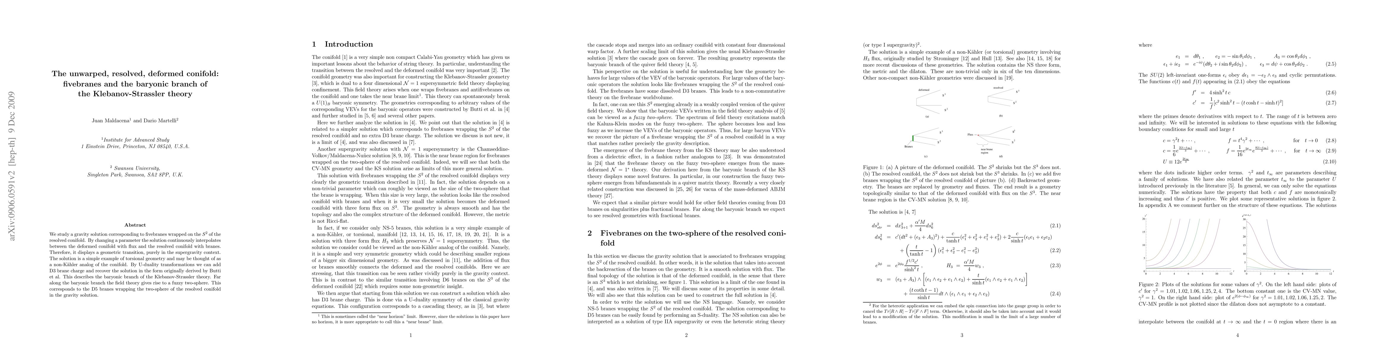 We study a gravity solution corresponding to fivebranes wrapped on the $S^2$ of the resolved conifold. By changing a parameter the solution continuously interpolates between the deformed conifold with flux and the resolved conifold with branes. Therefore, it displays a geometric transition, purely in the supergravity context. The solution is a simple example of torsional geometry and may be thought of as a non-K\"ahler analog of the conifold. By U-duality transformations we can add D3 brane charge and recover the solution in the form originally derived by Butti et al. This describes the baryonic branch of the Klebanov-Strassler theory. Far along the baryonic branch the field theory gives rise to a fuzzy two-sphere. This corresponds to the D5 branes wrapping the two-sphere of the resolved conifold in the gravity solution.