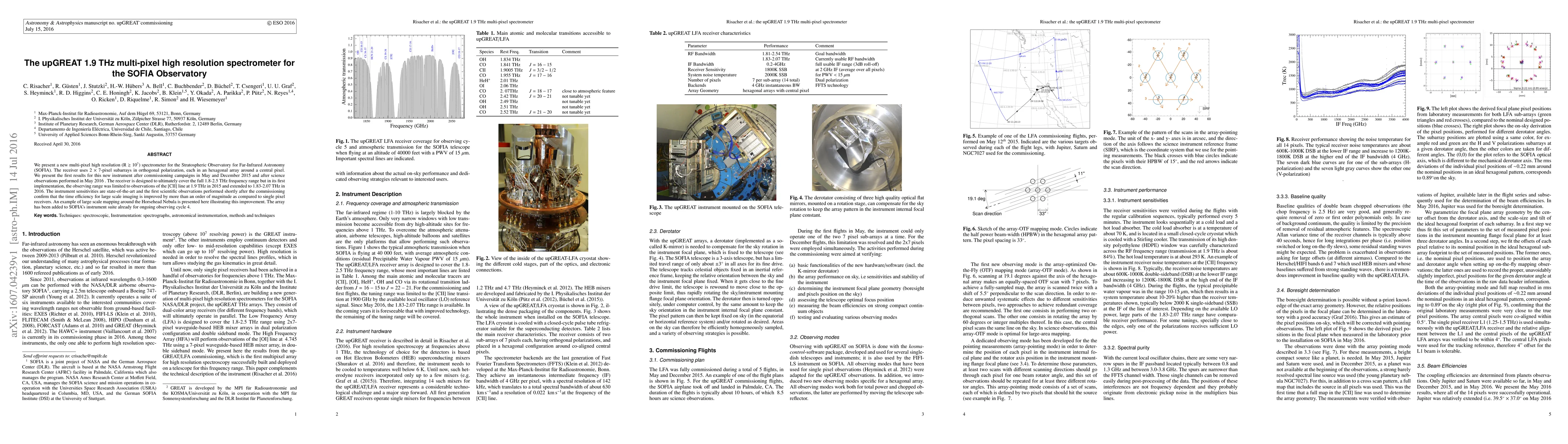 The upGREAT 1.9 THz multi-pixel high resolution spectrometer for SOFIA has been commissioned and demonstrated state-of-the-art sensitivities, significantly improving time efficiency for large scale imaging by over an order of magnitude compared to single pixel receivers. Initial observations around the Horsehead Nebula confirm its effectiveness.