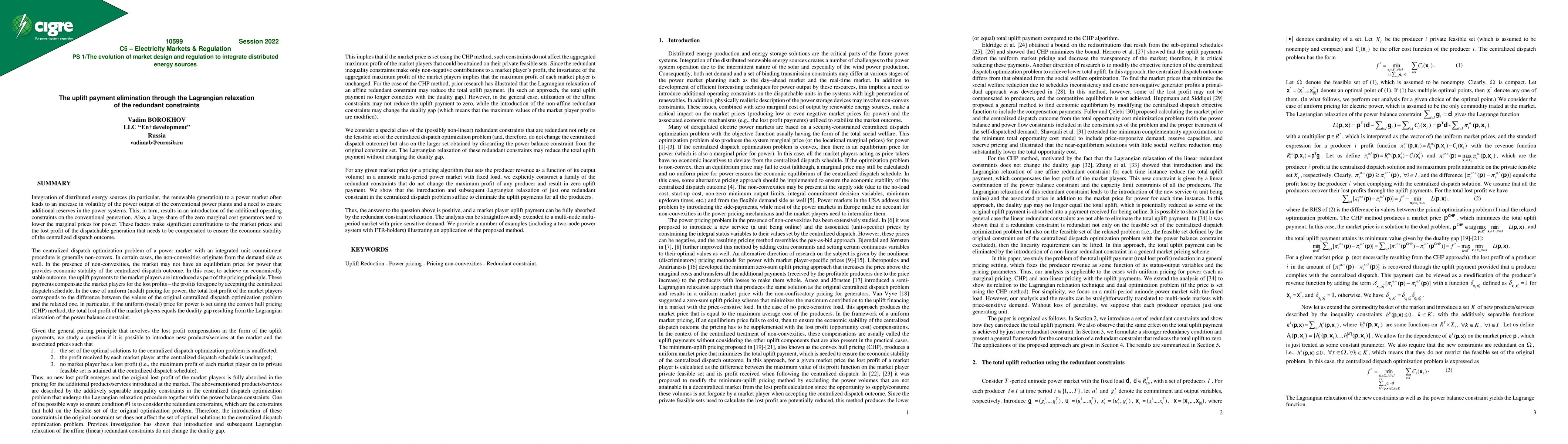 In the presence of non-convexities, the power market may not have an equilibrium price for power that provides economic stability of the centralized dispatch outcome. In this case, to achieve an economically stable outcome, the uplift payments to the market players are introduced as part of the pricing principle. Given the general pricing principle that involves the lost profit compensation in the form of the uplift payments, we study a question if it is possible to introduce new products/services at the market and the associated prices such that the set of the optimal solutions to the centralized dispatch optimization problem is unaffected, the profit received by each market player at the centralized dispatch schedule is unchanged, and no market player has lost profit. These new products/services and the corresponding prices can be viewed as originating from the Lagrangian relaxation of redundant constraints, which dot not change the centralized dispatch schedule. For any given market price (or a pricing algorithm that sets the producer revenue as a function of its output volume) in a uninode multi-period power market with fixed load, we explicitly construct a family of the redundant constraints that do not change the maximum profit of any producer and result in zero total uplift payment. The analysis can be straightforwardly extended to a multi-node multi-period market with price-sensitive demand.