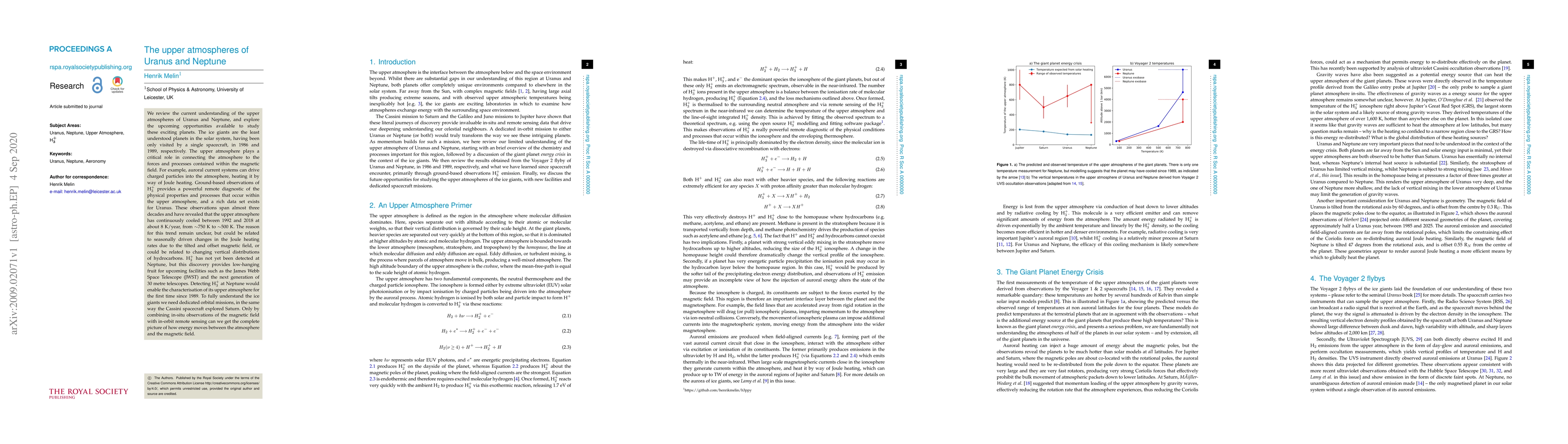 We review the current understanding of the upper atmospheres of Uranus and Neptune, and explore the upcoming opportunities available to study these exciting planets. The ice giants are the least understood planets in the solar system, having been only visited by a single spacecraft, in 1986 and 1989, respectively. The upper atmosphere plays a critical role in connecting the atmosphere to the forces and processes contained within the magnetic field. For example, auroral current systems can drive charged particles into the atmosphere, heating it by way of Joule heating. Ground-based observations of H$_3^+$ provides a powerful remote diagnostic of the physical properties and processes that occur within the upper atmosphere, and a rich data set exists for Uranus. These observations span almost three decades and have revealed that the upper atmosphere has continuously cooled between 1992 and 2018 at about 8 K/year, from $\sim$750 K to $\sim$500 K. The reason for this trend remain unclear, but could be related to seasonally driven changes in the Joule heating rates due to the tilted and offset magnetic field, or could be related to changing vertical distributions of hydrocarbons. H$_3^+$ has not yet been detected at Neptune, but this discovery provides low-hanging fruit for upcoming facilities such as the James Webb Space Telescope (JWST) and the next generation of 30 metre telescopes. Detecting H$_3^+$ at Neptune would enable the characterisation of its upper atmosphere for the first time since 1989. To fully understand the ice giants we need dedicated orbital missions, in the same way the Cassini spacecraft explored Saturn. Only by combining in-situ observations of the magnetic field with in-orbit remote sensing can we get the complete picture of how energy moves between the atmosphere and the magnetic field.