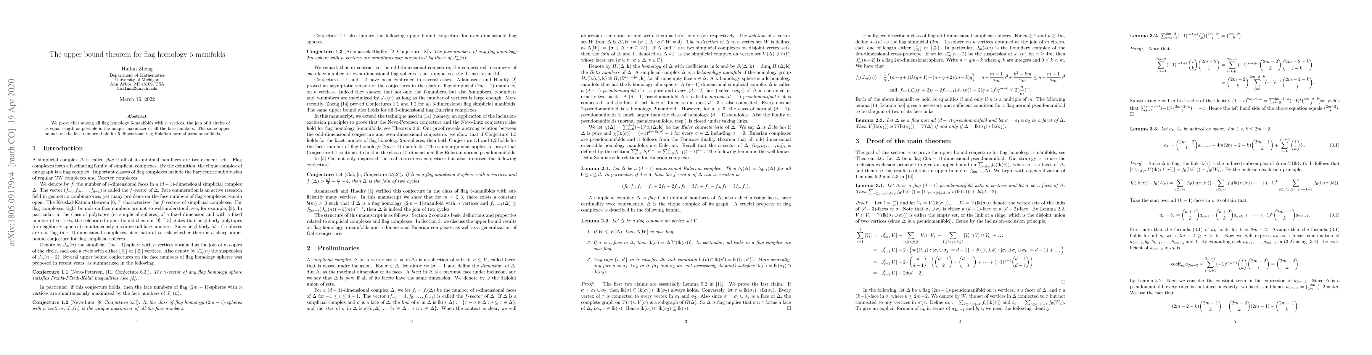 This paper proves that the join of three circles of equal length maximizes the face numbers among all flag homology 5-manifolds with $n$ vertices. The same upper bounds on face numbers apply to 5-dimensional flag Eulerian normal pseudomanifolds.