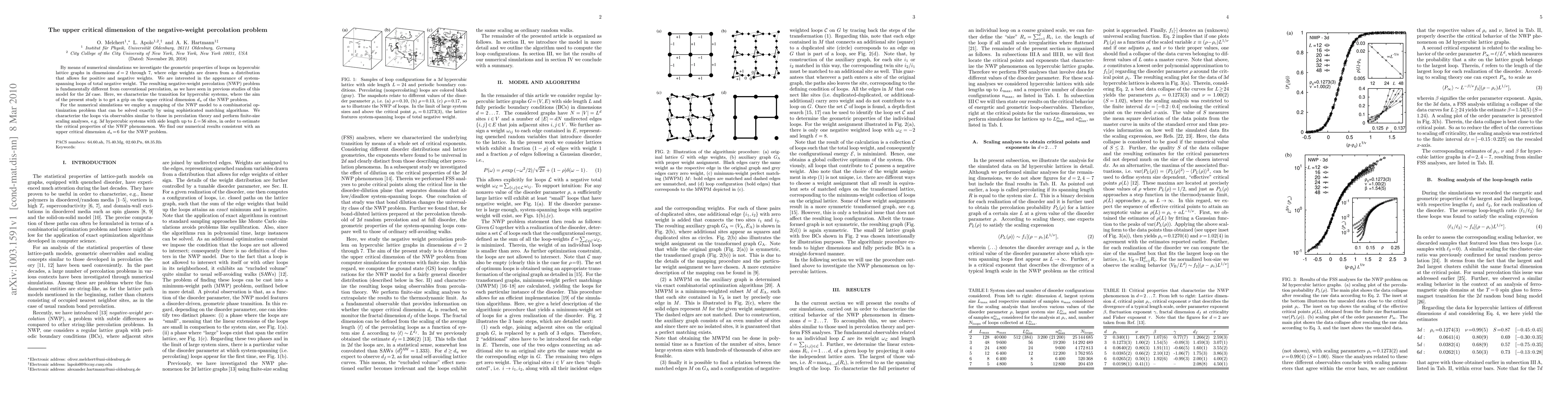 This paper investigates the negative-weight percolation (NWP) problem through numerical simulations on hypercubic lattices, finding that the upper critical dimension d_u for this phenomenon is 6. The study employs sophisticated matching algorithms to solve the combinatorial optimization problem mapped from NWP and uses finite-size scaling analyses to determine the critical properties.