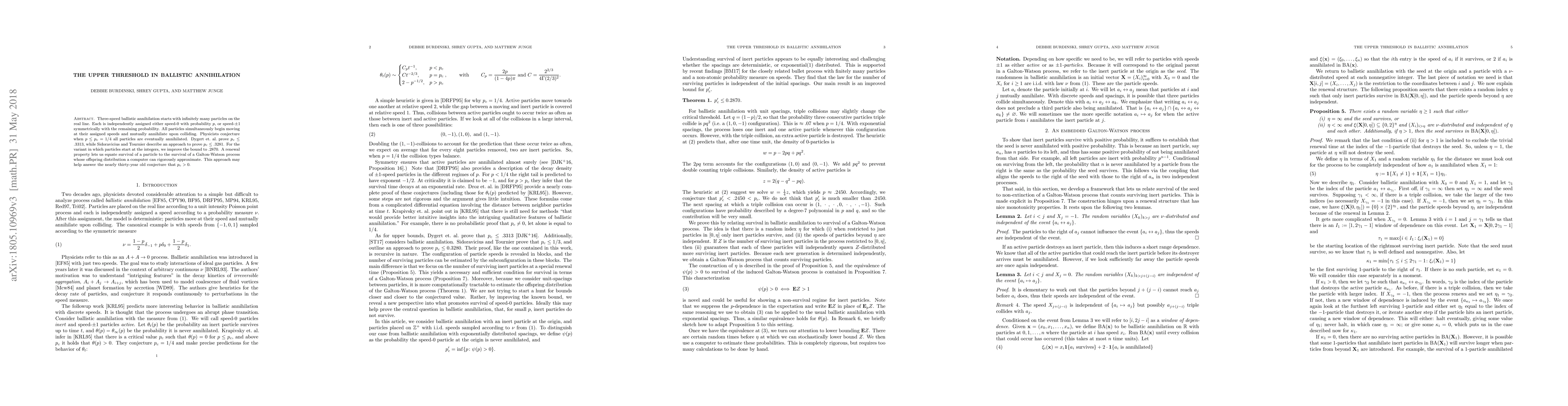 This research paper investigates the 'upper threshold in ballistic annihilation', a process involving particles on a real line moving at assigned speeds and annihilating on collision. The study refines the known upper bound for the critical probability ($p_c$) of complete annihilation from .3281 to .2870, utilizing a renewal property and comparing particle survival to a Galton-Watson process. This method could potentially resolve a long-standing conjecture about $p_c > 0$.
