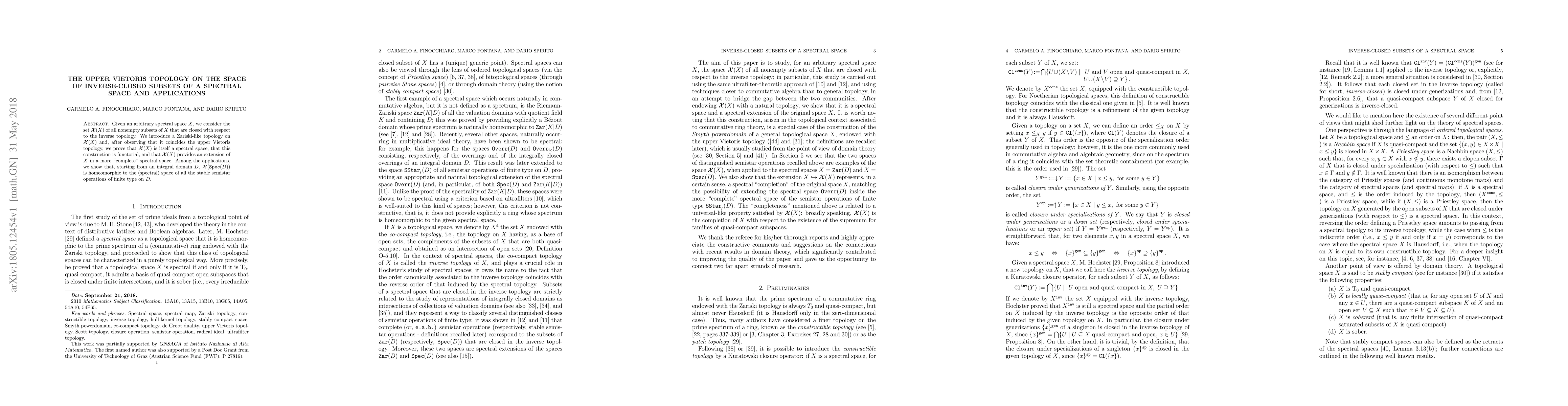 Given an arbitrary spectral space $X$, we consider the set ${\boldsymbol{\mathcal{X}}}(X)$ of all nonempty subsets of $X$ that are closed with respect to the inverse topology. We introduce a Zariski-like topology on ${\boldsymbol{\mathcal{X}}}(X)$ and, after observing that it coincides the upper Vietoris topology, we prove that ${\boldsymbol{\mathcal{X}}}(X)$ is itself a spectral space, that this construction is functorial, and that ${\boldsymbol{\mathcal{X}}}(X)$ provides an extension of $X$ in a more `complete' spectral space. Among the applications, we show that, starting from an integral domain $D$, ${\boldsymbol{\mathcal{X}}}(\mathrm{Spec}(D))$ is homeomorphic to the (spectral) space of all the stable semistar operations of finite type on $D$.