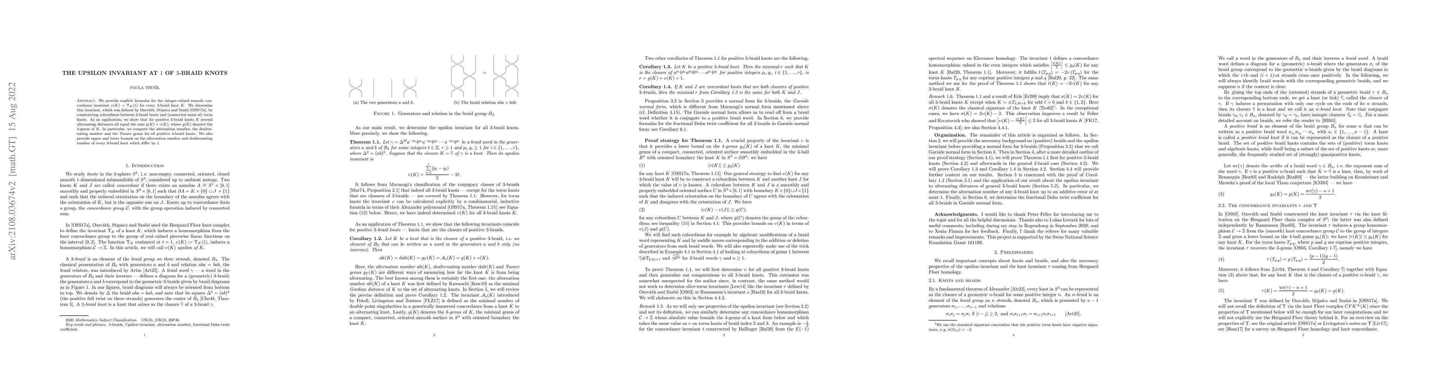 We provide explicit formulas for the integer-valued smooth concordance invariant $\upsilon(K) = \Upsilon_K(1)$ for every 3-braid knot $K$. We determine this invariant, which was defined by Ozsv\'ath, Stipsicz and Szab\'o, by constructing cobordisms between 3-braid knots and (connected sums of) torus knots. As an application, we show that for positive 3-braid knots $K$ several alternating distances all equal the sum $g(K) + \upsilon(K)$, where $g(K)$ denotes the 3-genus of $K$. In particular, we compute the alternation number, the dealternating number and the Turaev genus for all positive 3-braid knots. We also provide upper and lower bounds on the alternation number and dealternating number of every 3-braid knot which differ by 1.